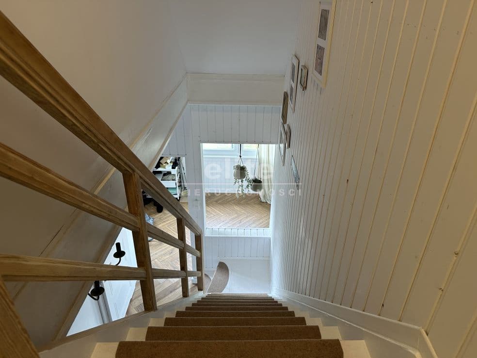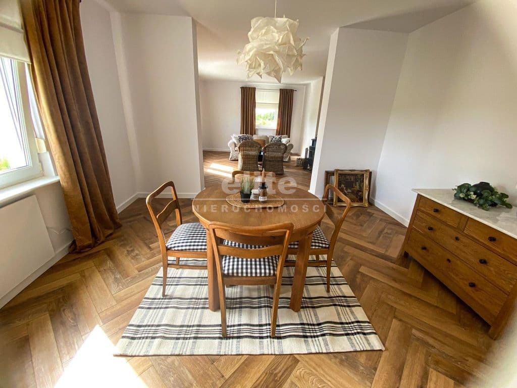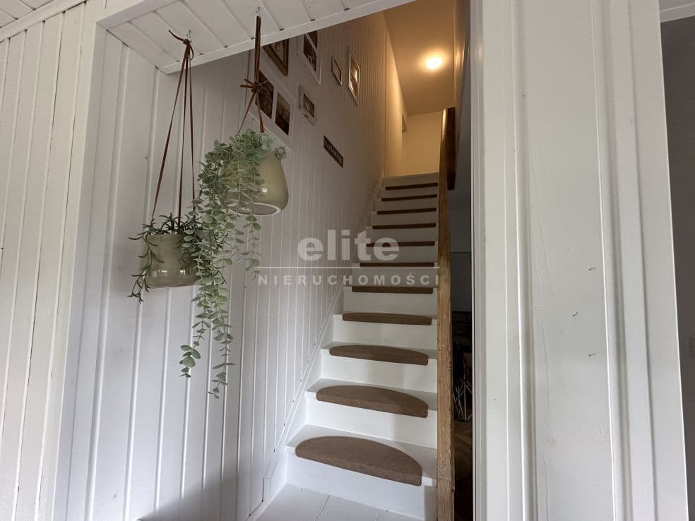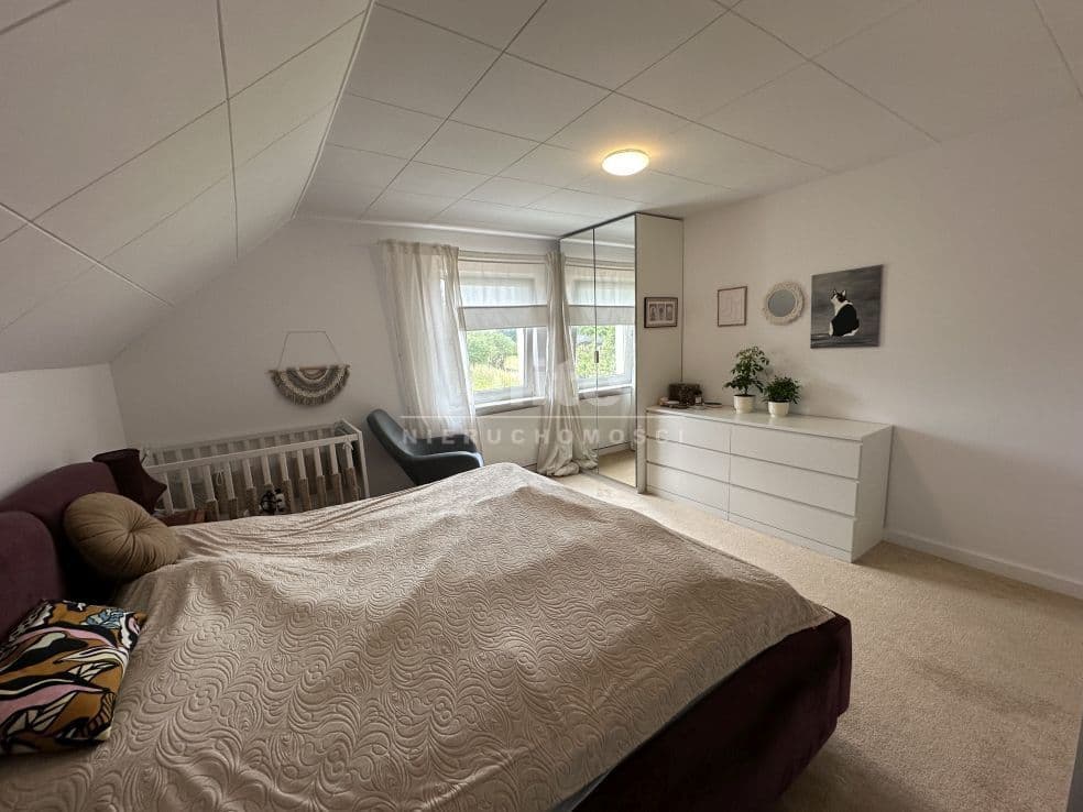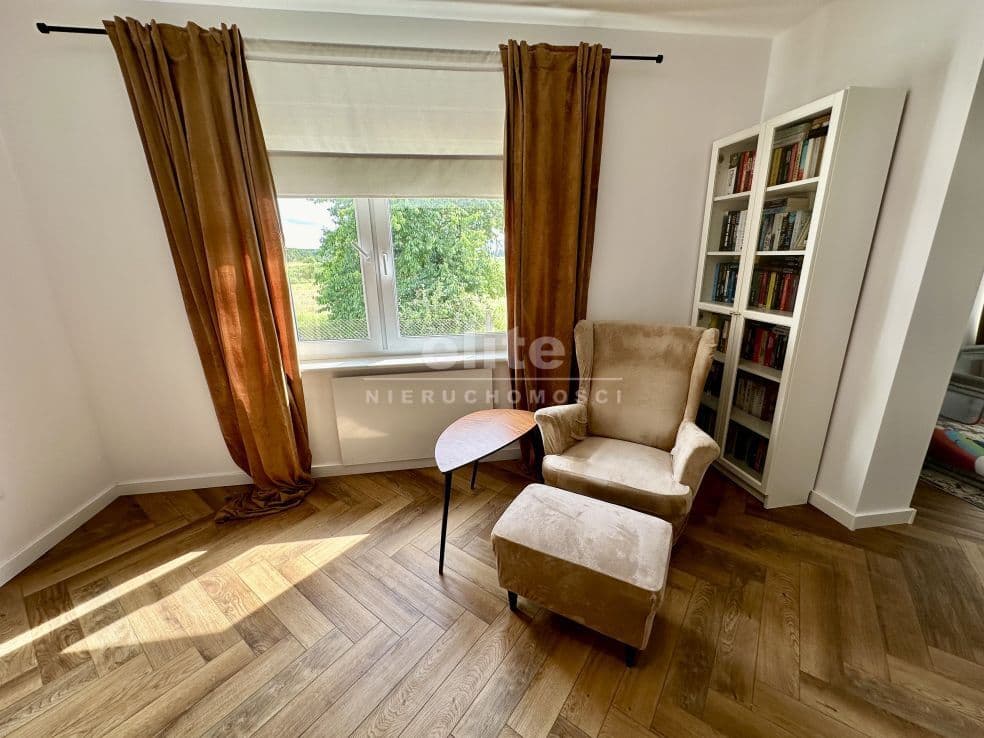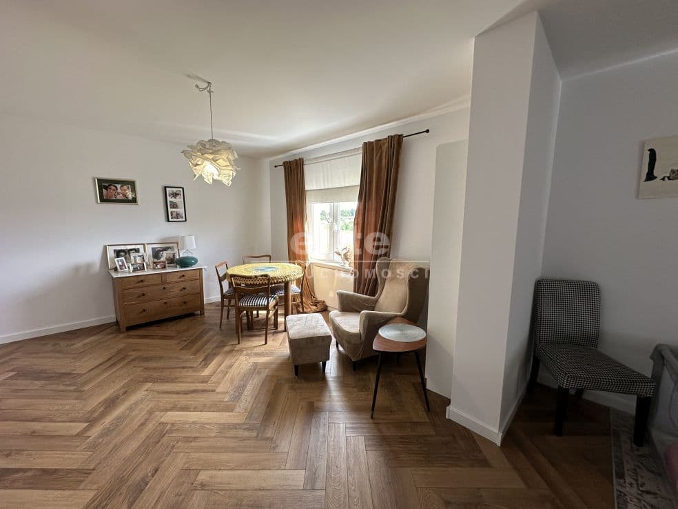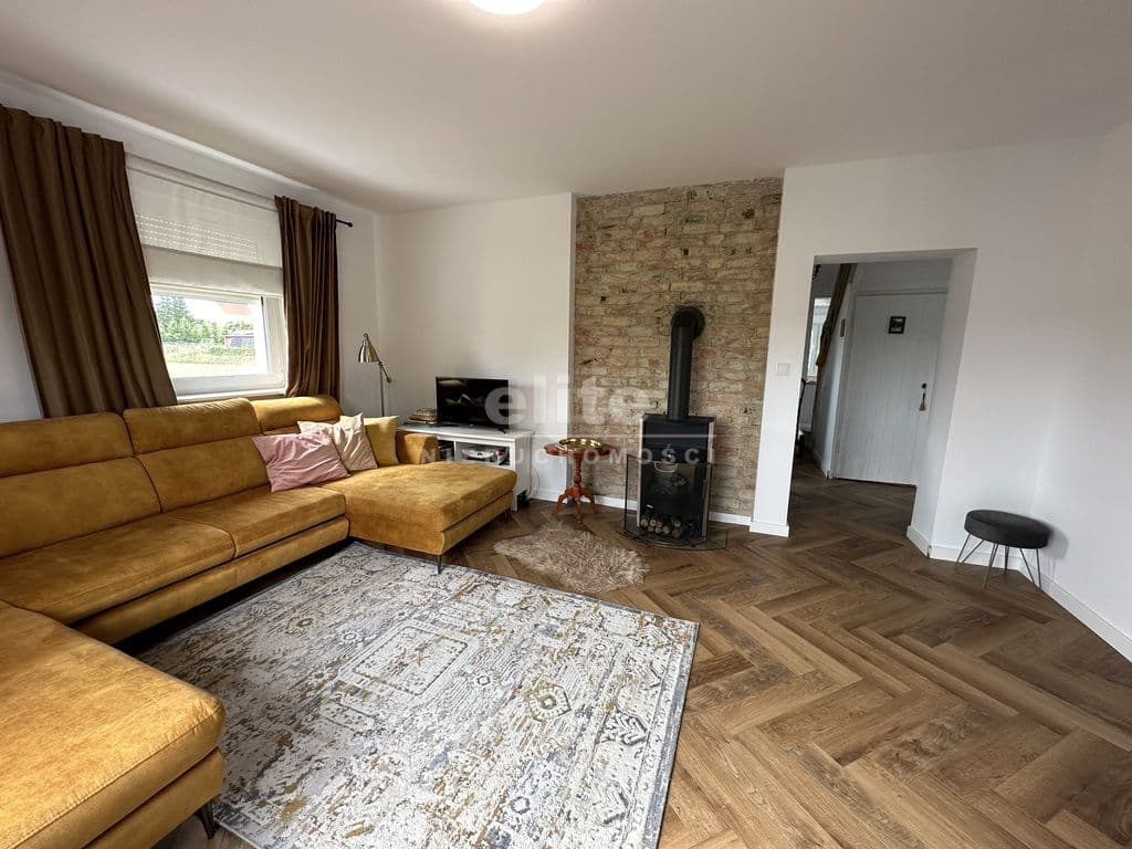 Układ pomieszczeń: na parterze znajduje się przestronny przedsionek, łazienka z prysznicem (ogrzewanie podłogowe), kuchnia, sypialnia i ogromny salon. Na piętrze znajdziemy dwie sypialnie, toaletę i pomieszczenie gospodarcze, które można przeznaczyć na garderobę. Pomieszczenia są przestronne, jasne, a dom posiada niepowtarzalny klimat. Na podłogach panele, kafle, w sypialniach - wykładzina.