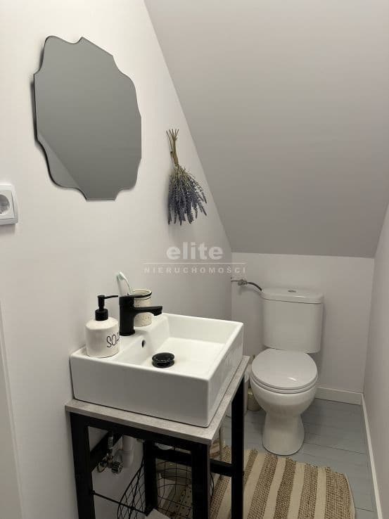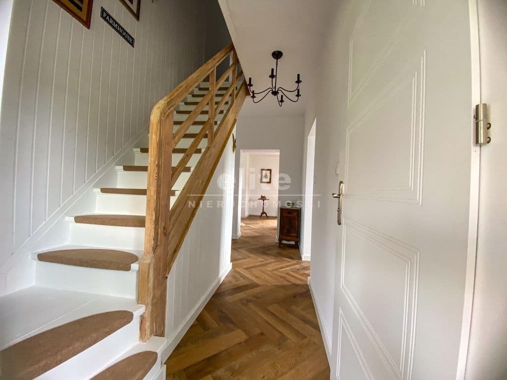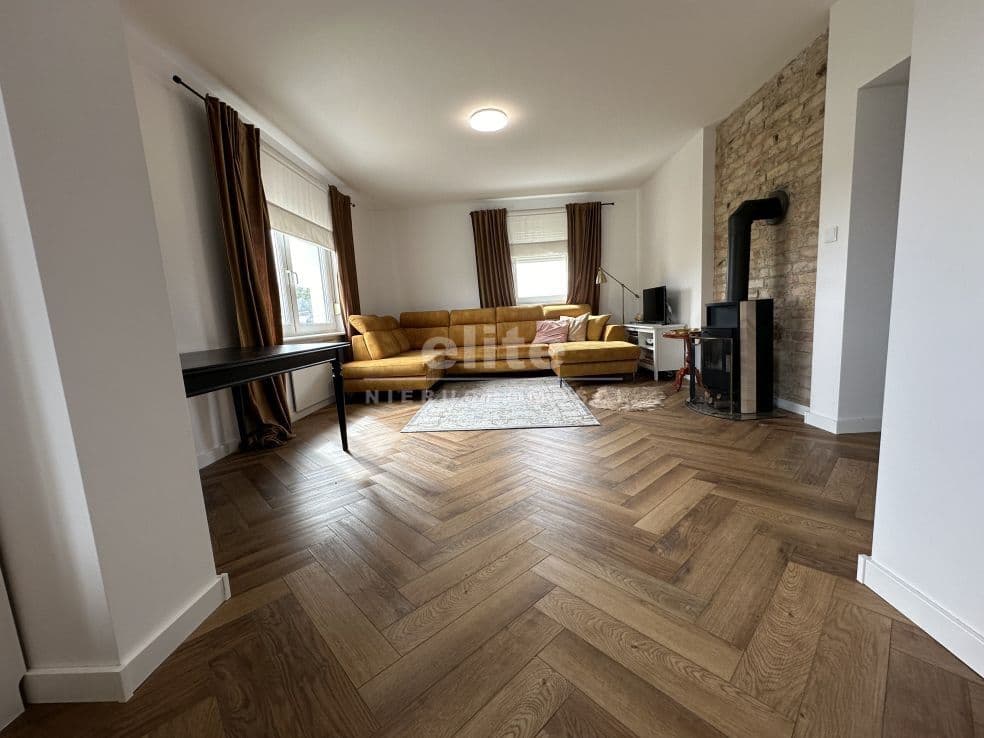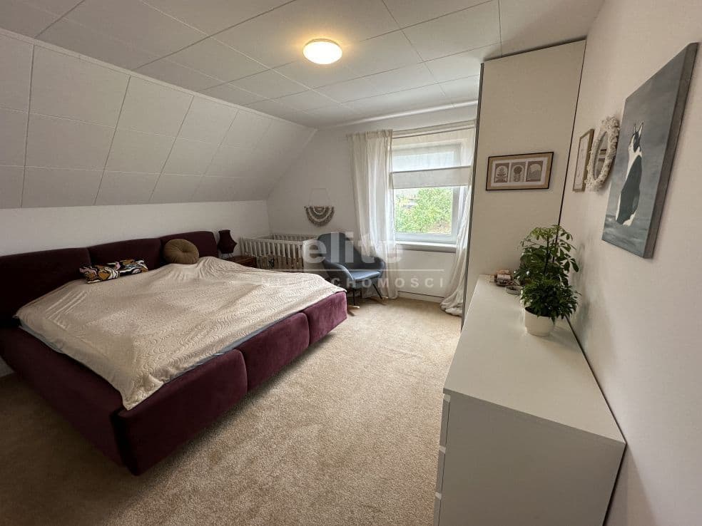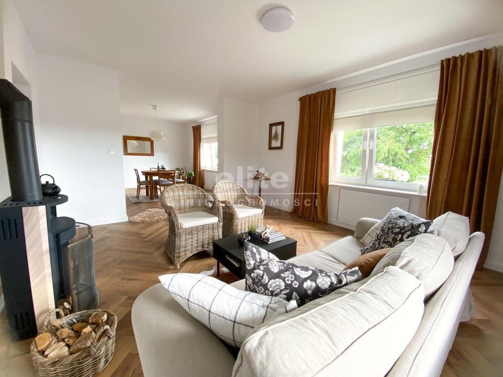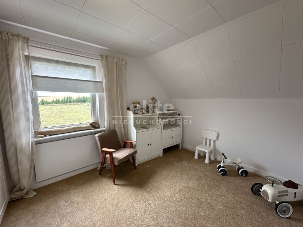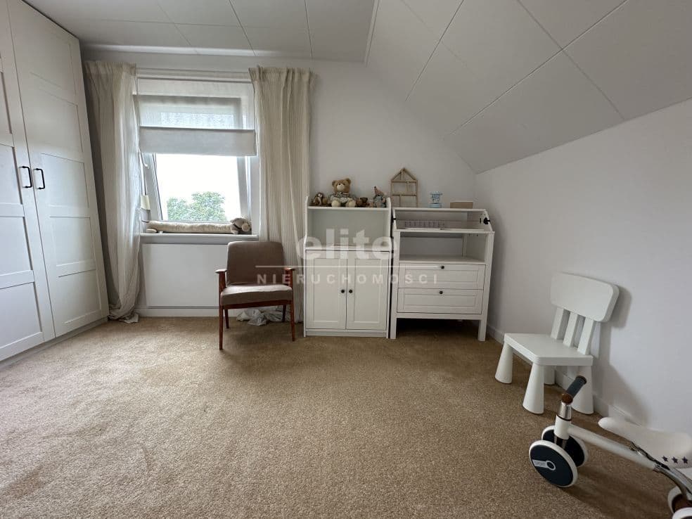 Układ pomieszczeń: na parterze znajduje się przestronny przedsionek, łazienka z prysznicem (ogrzewanie podłogowe), kuchnia, sypialnia i ogromny salon. Na piętrze znajdziemy dwie sypialnie, toaletę i pomieszczenie gospodarcze, które można przeznaczyć na garderobę. Pomieszczenia są przestronne, jasne, a dom posiada niepowtarzalny klimat. Na podłogach panele, kafle, w sypialniach - wykładzina.