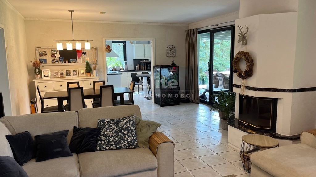 Liczne nasadzenia roślin i drzew (z automatycznym nawadnianiem ogrodu), miejsce do grillowania, palenisko na ognisko, pom. gospodarcze około 45m2 z dużym wybiegiem dla psa (około 100m2).