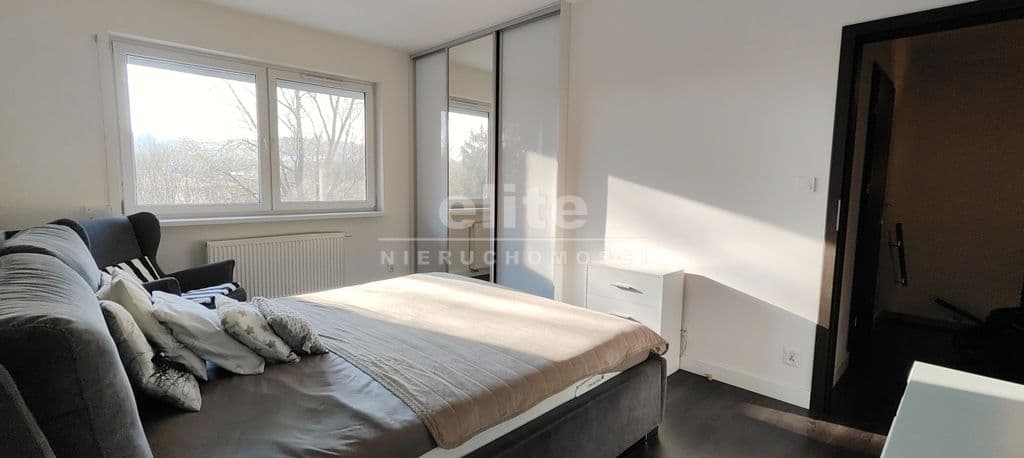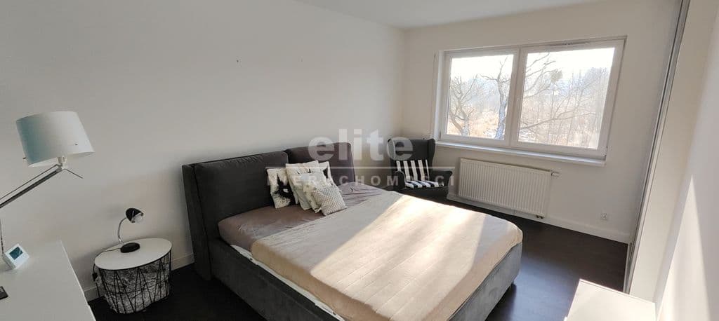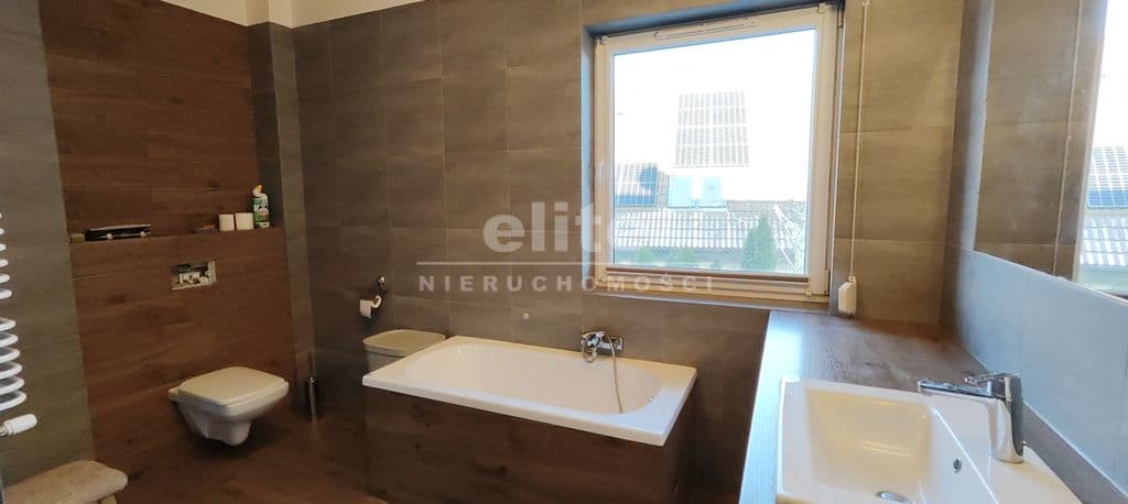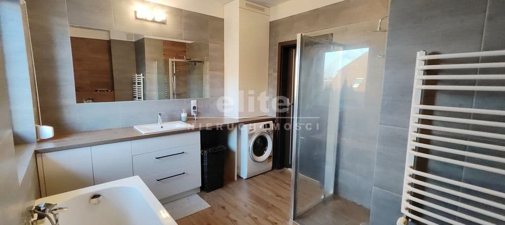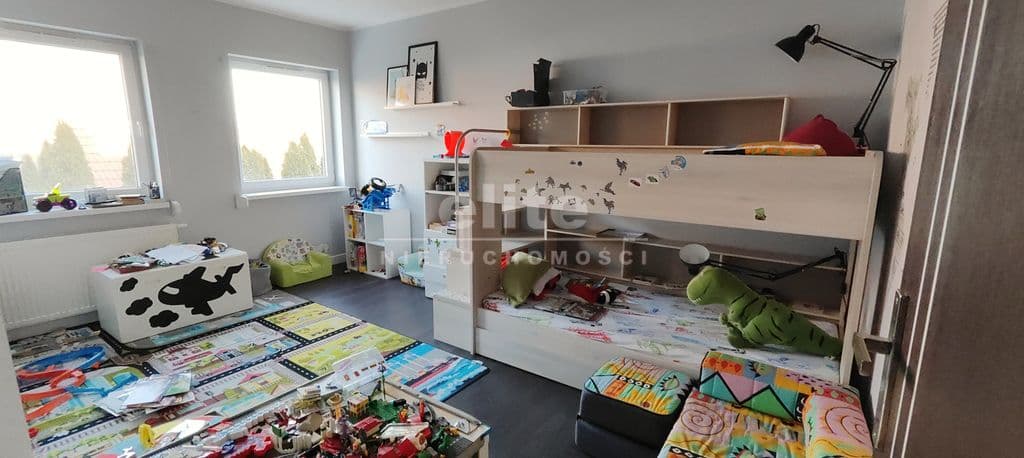 Na piętro prowadzą solidne, wylewane schody, wykończone w podobnym stylu jak podłogi. Przestrzeń, ok. 70m2, podzielona została pomiędzy 3 sypialnie oraz dużą łazienkę z oknem. Największa sypialnia, która stanowi obecnie pokój dziecięcy ma ok. 16m2 i posiada dużą szafę w zabudowie. Dwie pozostałe sypialnie, po również ok. 16m2, to słoneczne pomieszczenia, zbliżone kształtem do kwadratu, co sprawa, że są bardzo ustawne. Duża łazienka o powierzchni ok. 10m2 posiada prysznic, wannę, dużą umywalkę z zabudową meblową i miejscem na pralkę oraz suszarkę. W korytarzu znajduje się wyłaz z rozkładaną drabiną na strych, na którym można przechowywać wiele rzeczy.