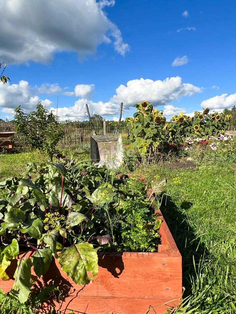 Zagospodarowany ogródek, nasadzenia (drzewka owocowe), wędzarnia oraz dwa drewniane budynki gospodarcze.