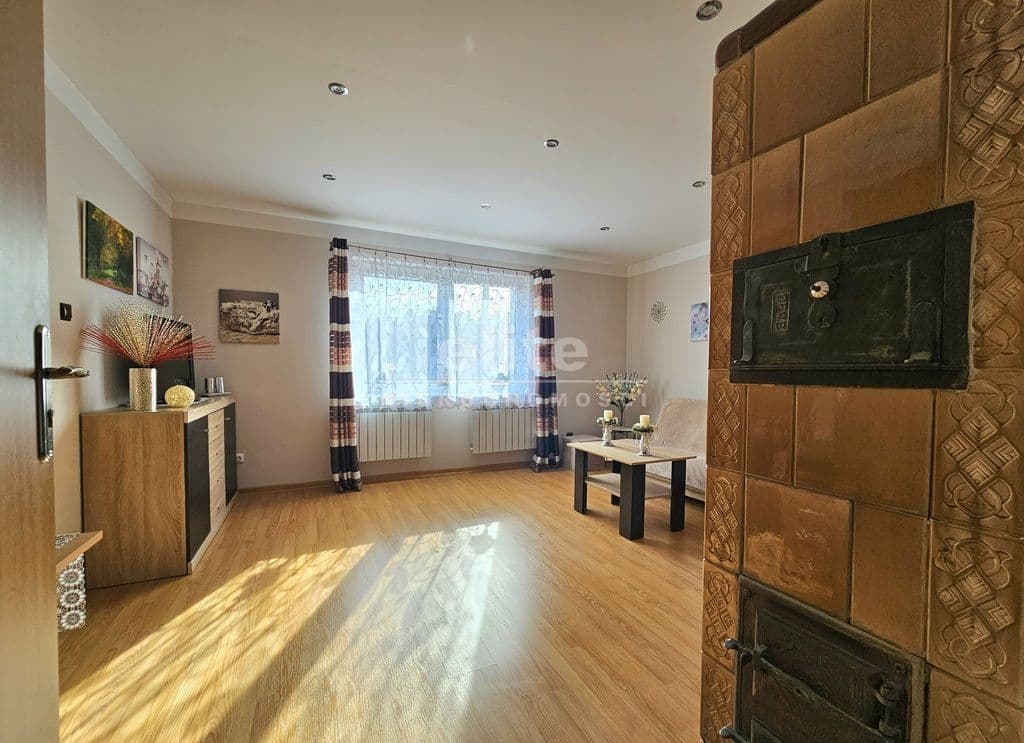 - pokój z piecem kaflowym – ok. 21 m², panele, ściany malowane