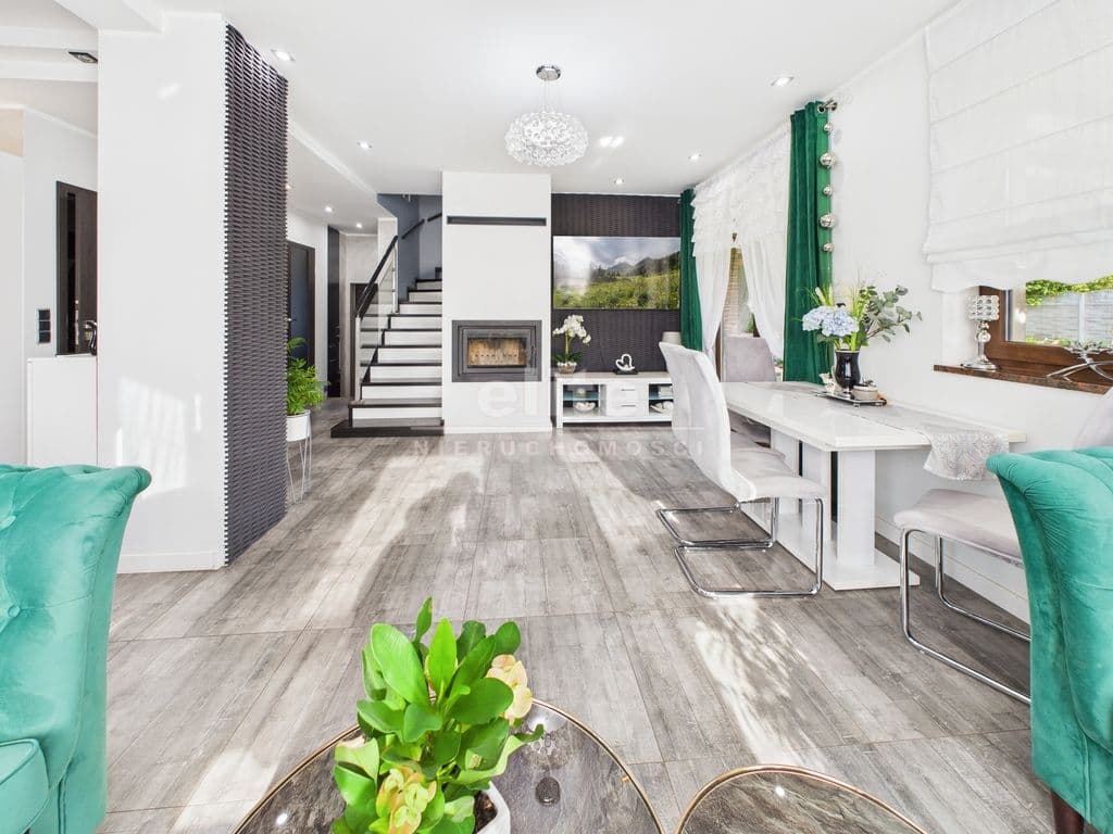 * przestronny i jasny salon z kominkiem i wyjściem na taras,