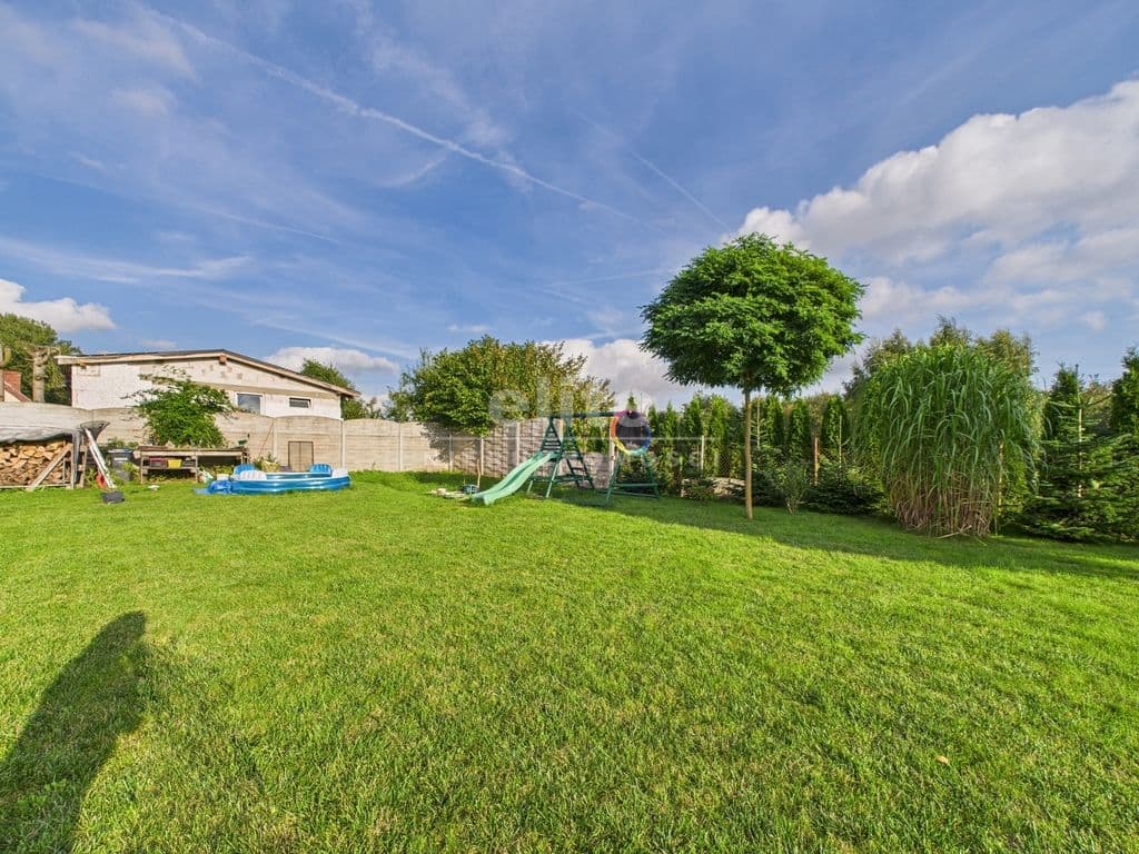 Duża, zadbana działka 1823 m² – perfekcyjne miejsce na relaks, zabawy dzieci i spotkania rodzinne.