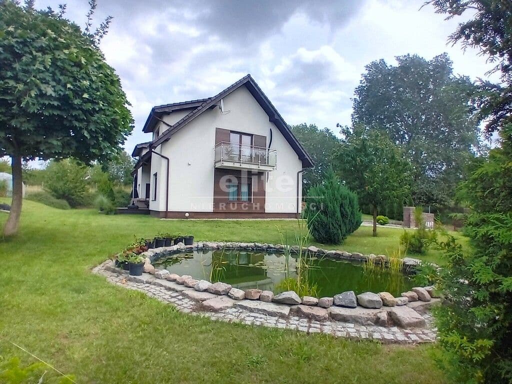 Przed domem wita nas duża brama wjazdowa, za nią znajduje się plac wyłożony kamieniem. Z kolei już na terenie zielonym mieści się drewutnia, oraz oczko wodne.