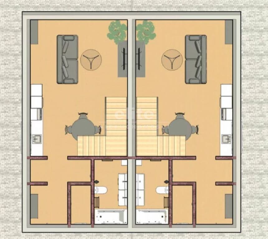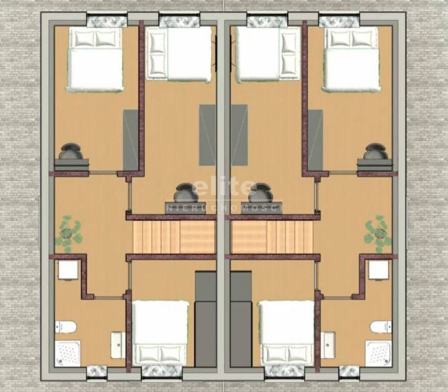 Dom składa się z 4 pokoi, dużego salonu na parterze połączonego z aneksem kuchennym z wyjściem na słoneczny taras, 2 łazienek, 3 sypialni na piętrze oraz pomieszczenia gospodarczego.