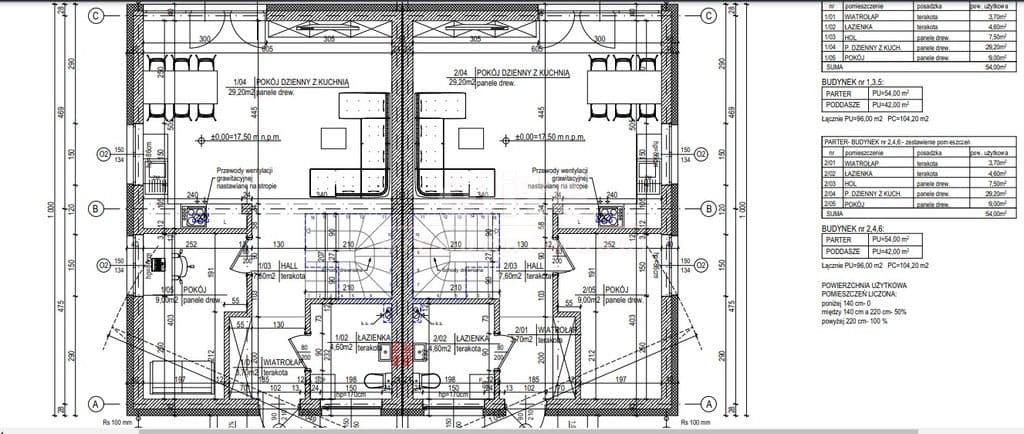 Powierzchnia całkowita lokalu wynosi 104 m2. Przemyślany układ pomieszczeń zapewnia wyraźny podział na strefę dzienną oraz prywatną: