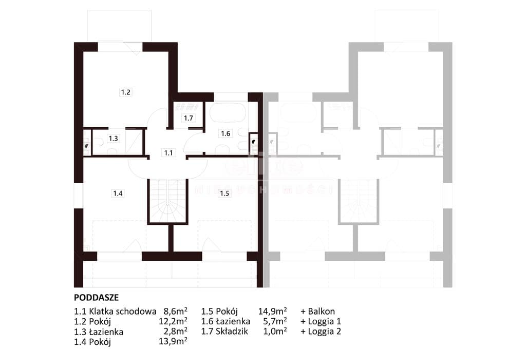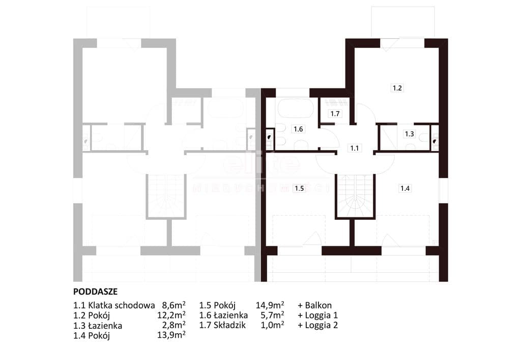 - sypialnia 15m2: 12,2 m2 sypialnia, łazienka 2,8 m2,