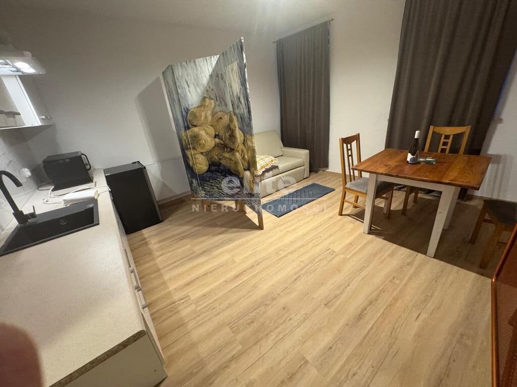 Jedno nowoczesne mieszkanie jednopokojowe z aneksem kuchennym.