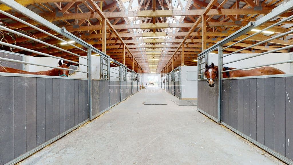 Budynek stajni wraz z zapleczem z 2014 roku o powierzchni użytkowej 822, 51 m2, konstrukcja murowana, bez podpiwniczenia. Stajnię stanowią boksy 9 szt. i boksy angielskie 10 szt., samodzielne mieszkanie, warsztat, magazyn, gabinet badań , siodlarnia, myjnie, biegalnie, pomieszczenia techniczne ( pompa ciepła) i komunkikacja.