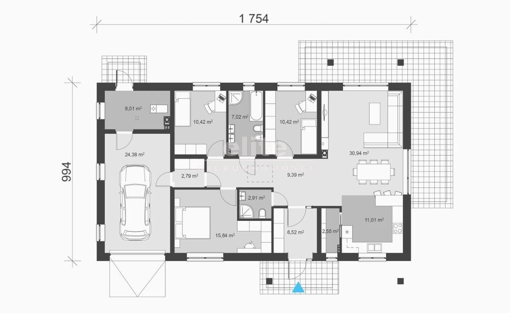 - salon z jadalnią i kominkiem - 30,94 m²,
