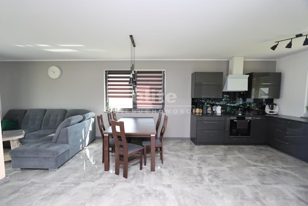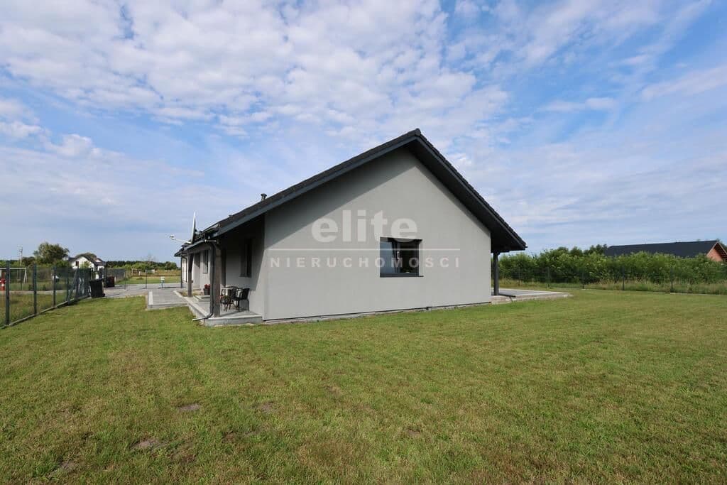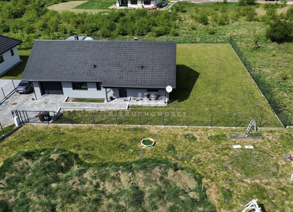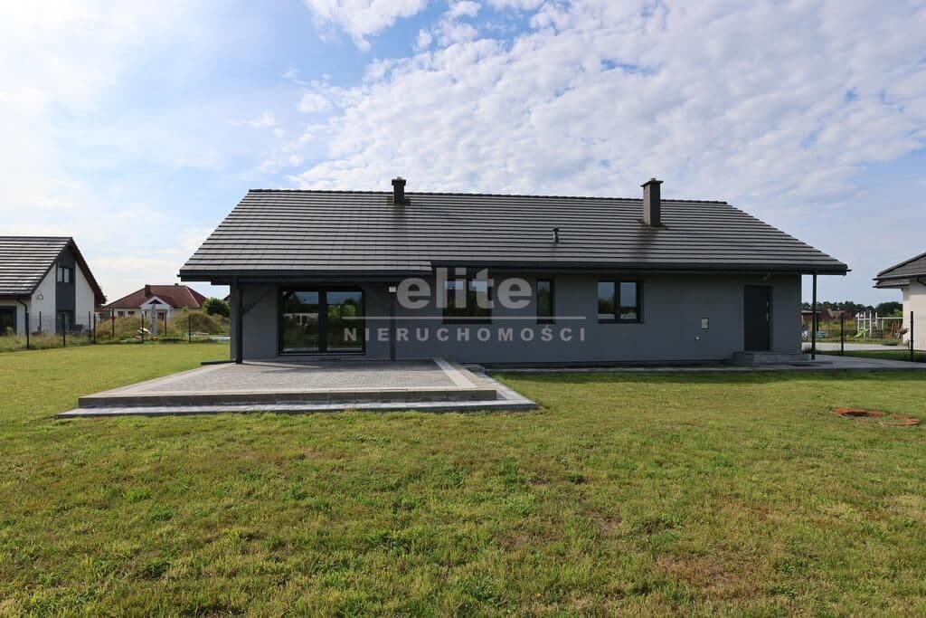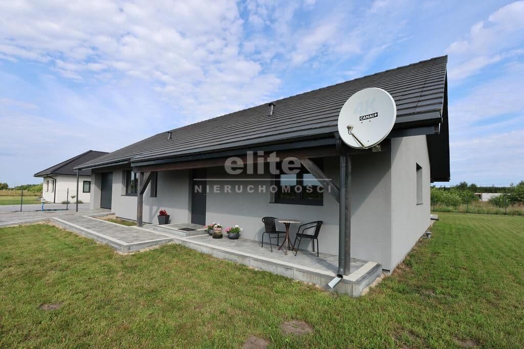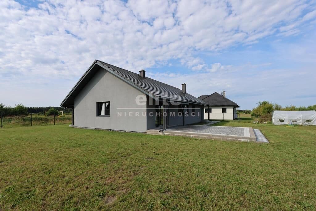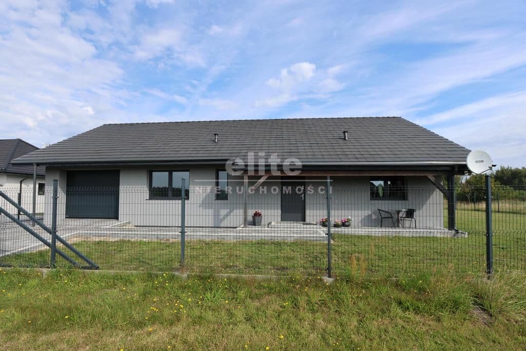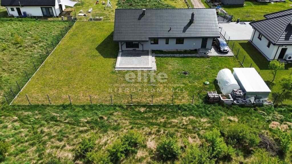 Dom parterowy o pow. użytkowej 109,80 m² (salon z aneksem kuchennym i jadalnią + 3 pokoje, 2 łazienki, garderoba), położony na osiedlu domów jednorodzinnych, w niedalekiej odległości od lasu. Dojazd drogą prywatną utwardzoną. To doskonała nieruchomość dla rodziny 2+2.