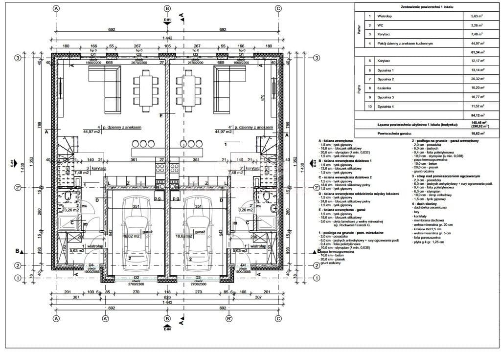 Łącznie: 145,46 m2 + Garaż: 18,62 m2.