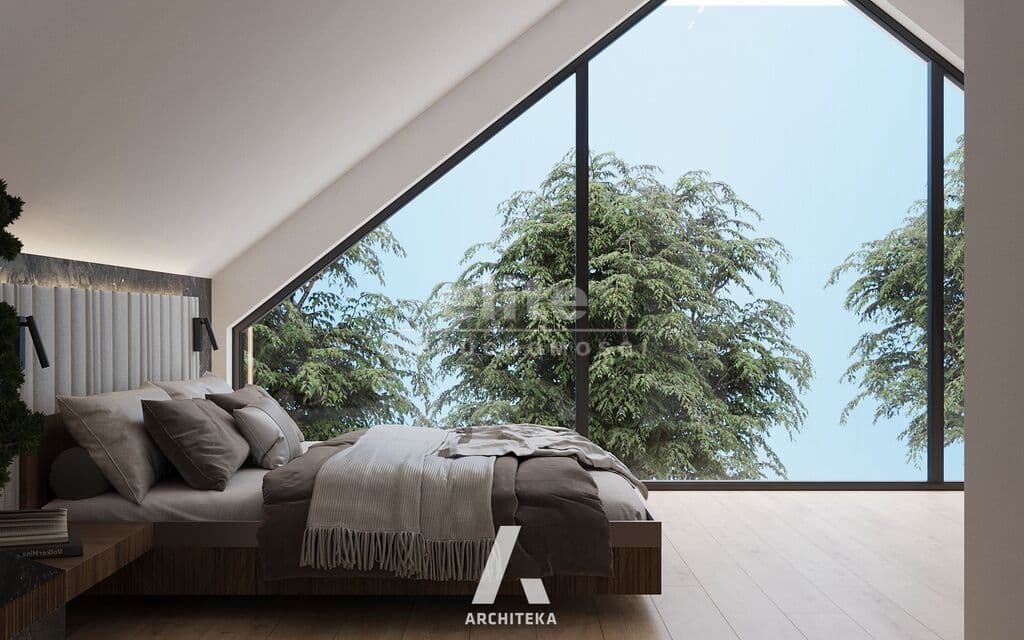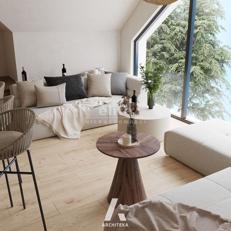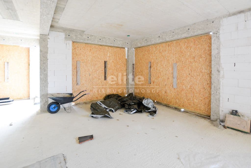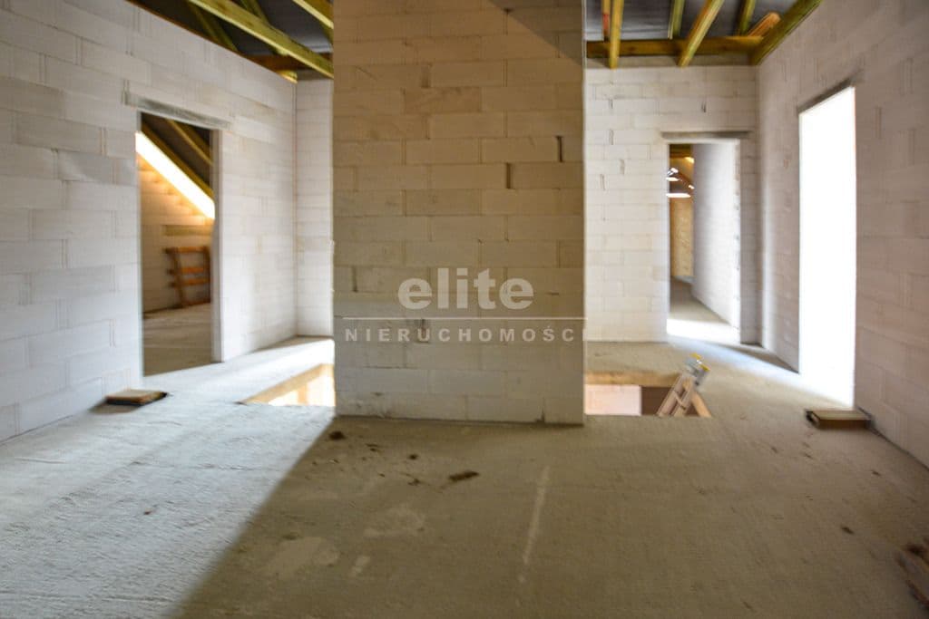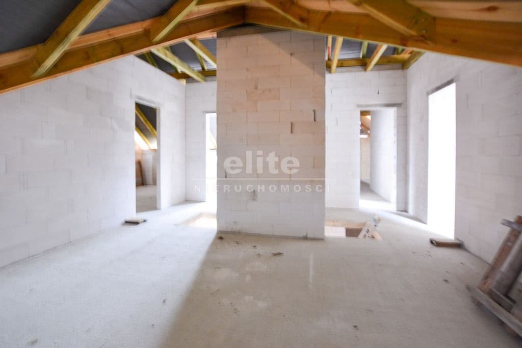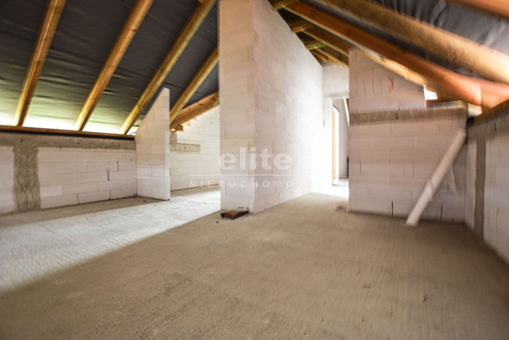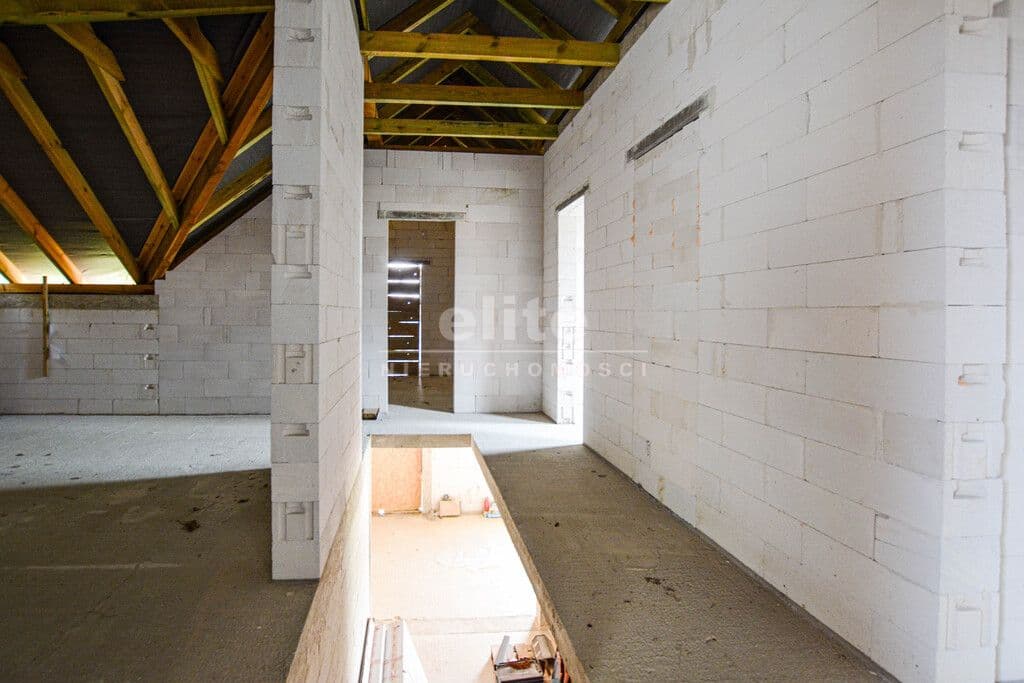 Budynek wolnostojący z użytkowym poddaszem, posadowiony na działce o powierzchni 1373m² Nieruchomość w stanie surowym, bez okien. Dach kryty dachówką Creaton Koda.