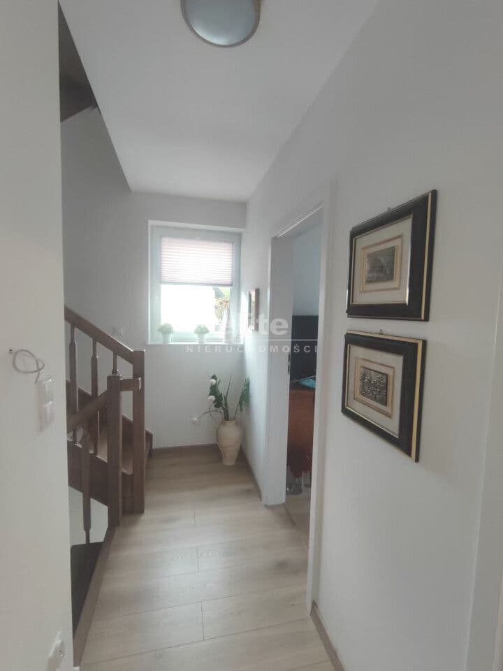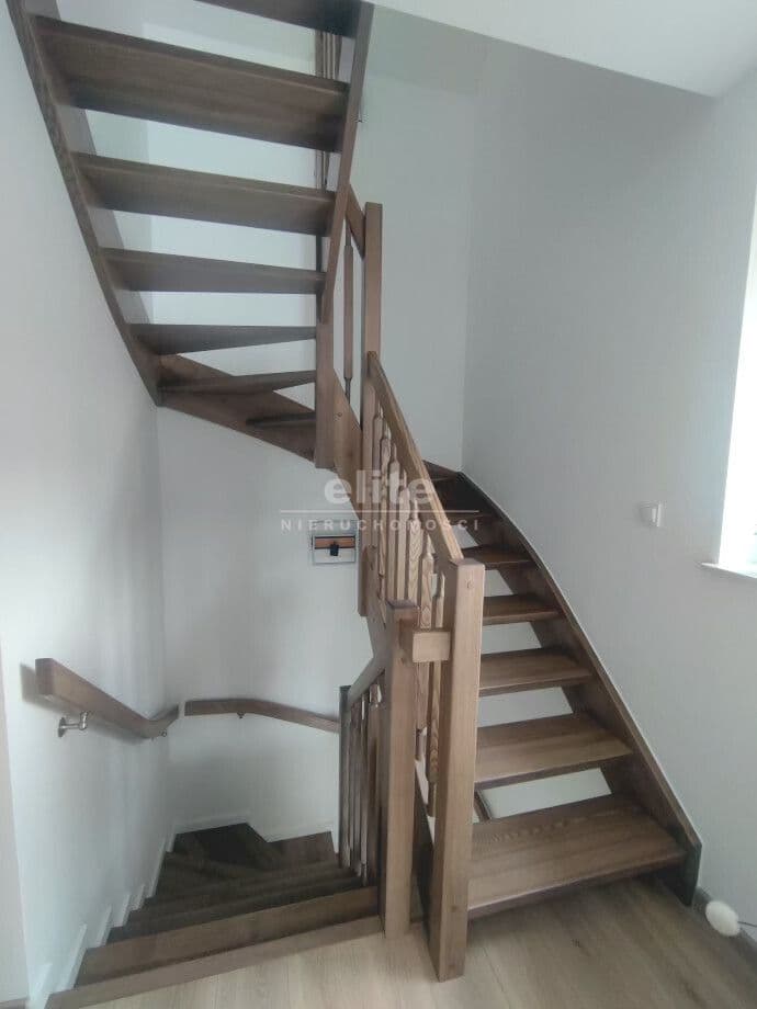 Na piętro prowadzą schody wyłożone jesionowym drewnem.