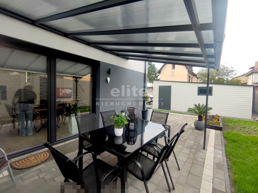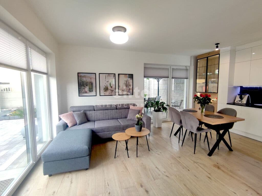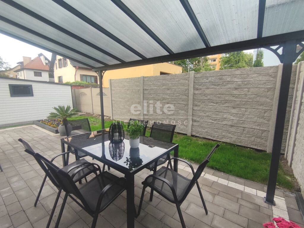 Z salonu wyjście na urządzony i zadaszony taras i ogródek, miejsce do wypoczynku na świeżym powietrzu.
