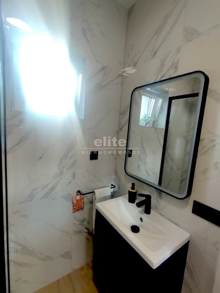 Nowoczesna łazienka z prysznicem typu "walk in", toaleta, ceramiczna umywalka i podświetlane lustro.