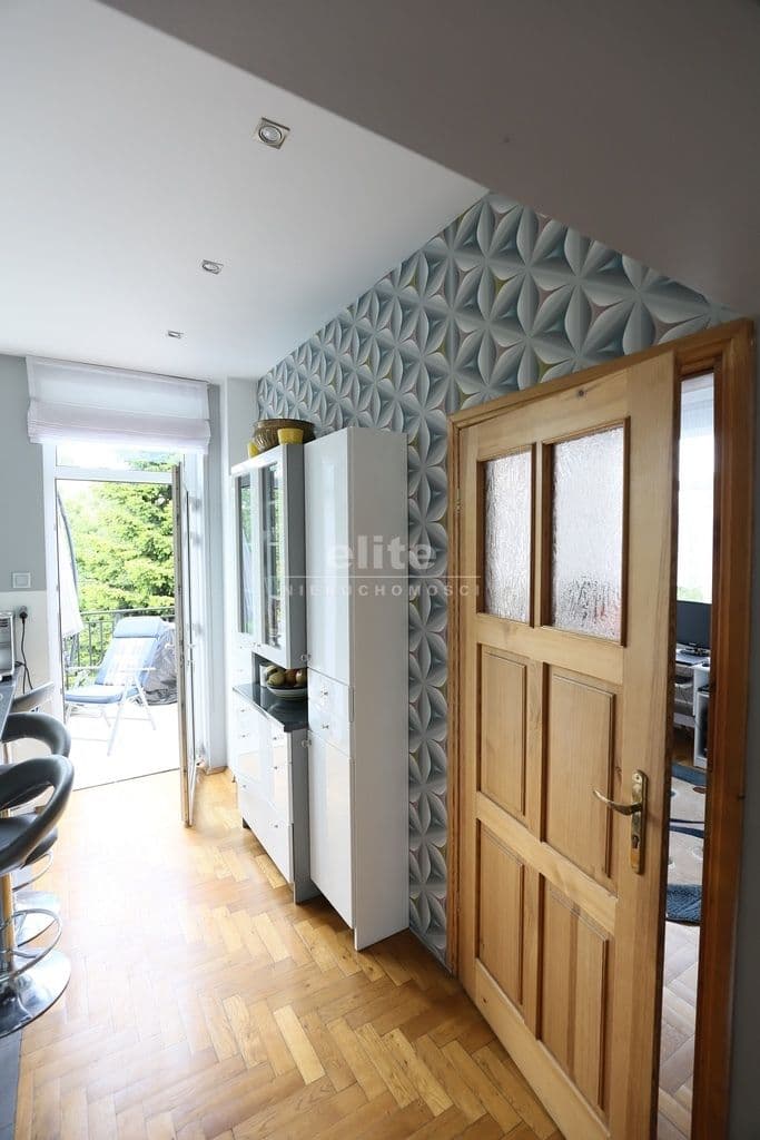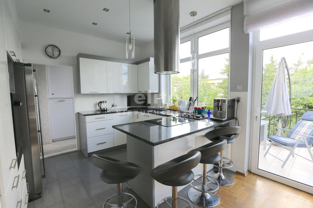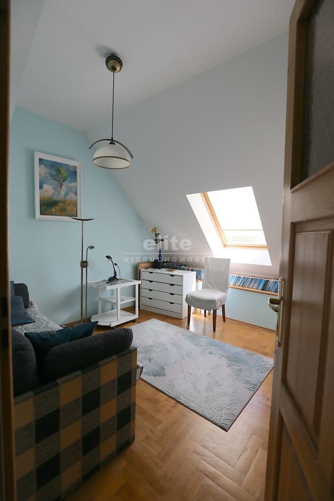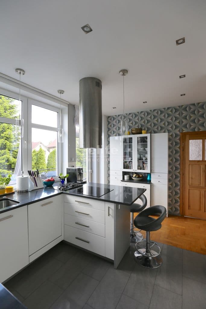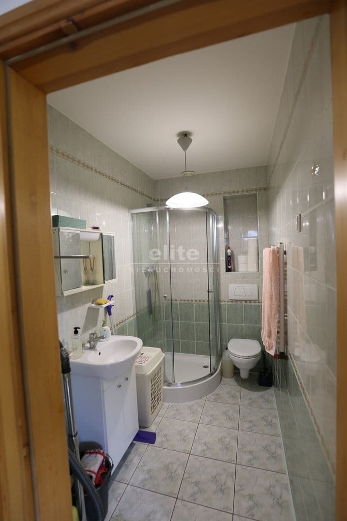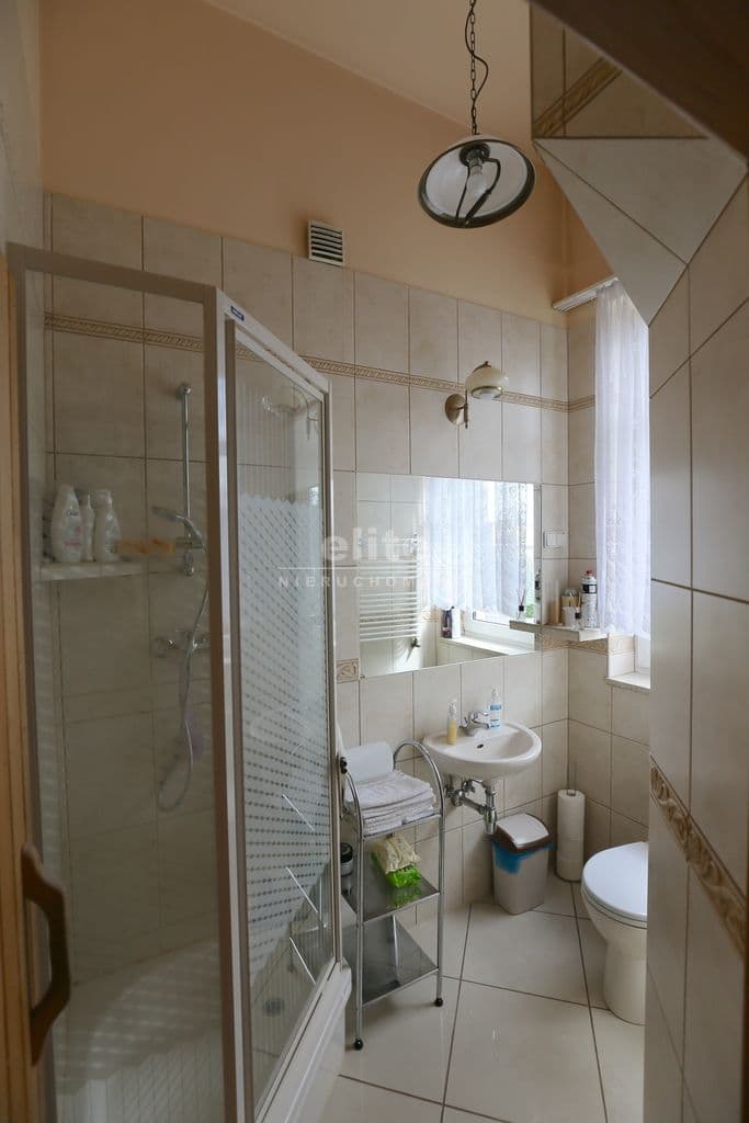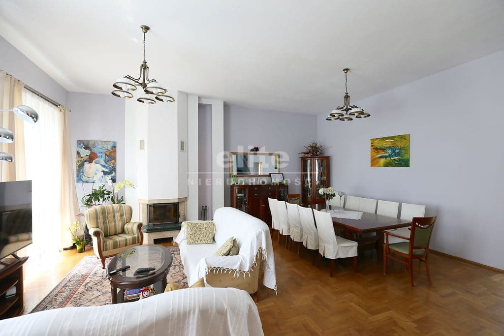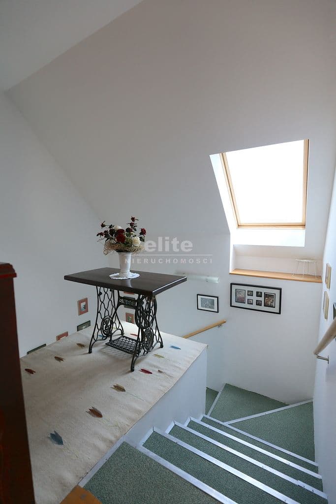 Na I piętro prowadzi obszerna klatka schodowa gdzie znajduje się przestronny salon o pow 46 m2 z kominkiem i klimatyzacją , łazienka z sauną oraz duża kuchnia w pełni umeblowana z wyjściem na taras . Przy kuchni spiżarnia w pełni zabudowana oraz pokój gościnny.