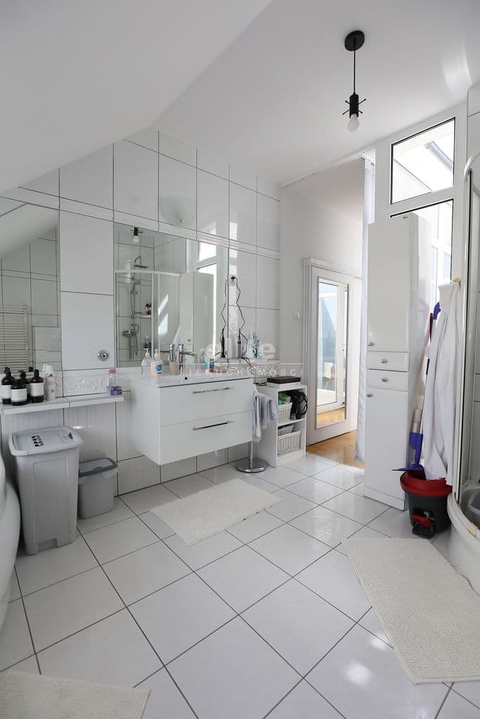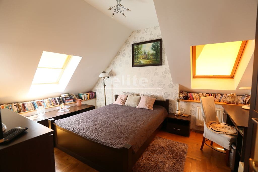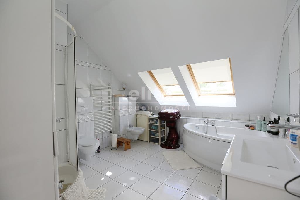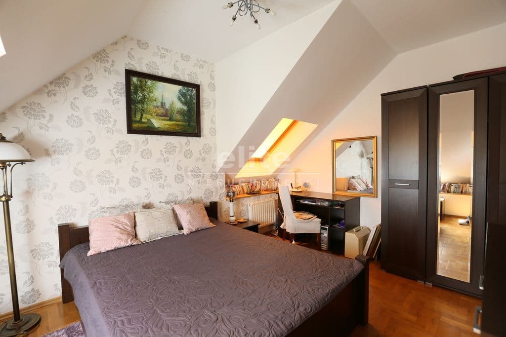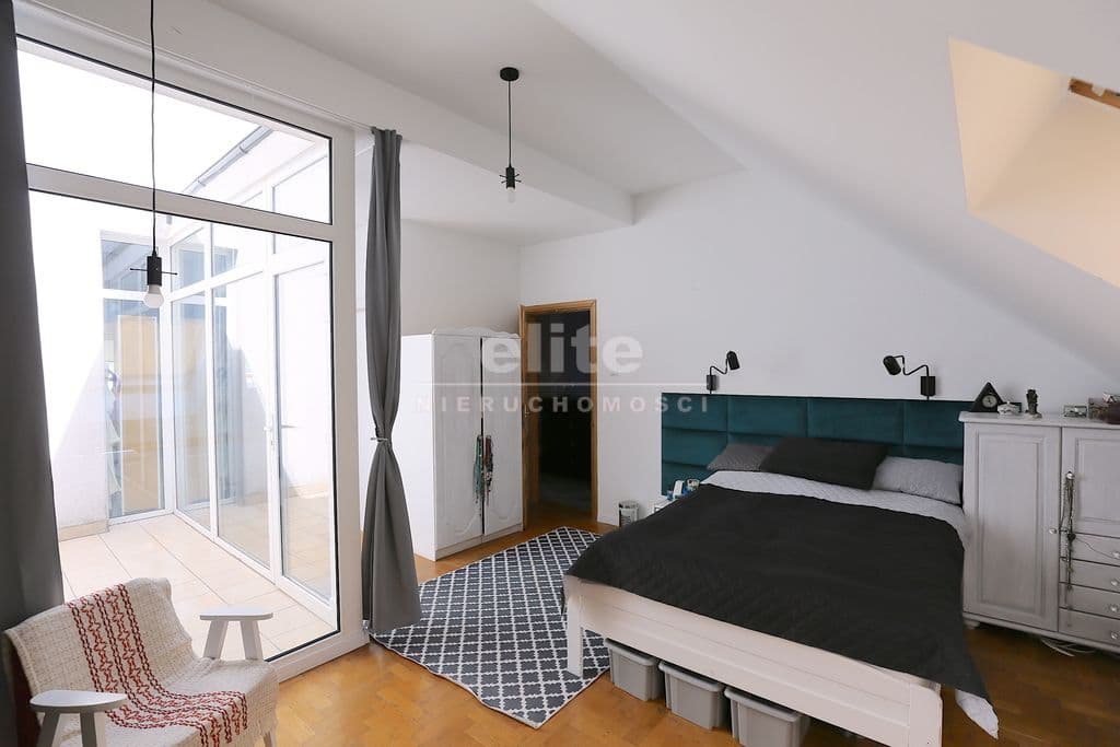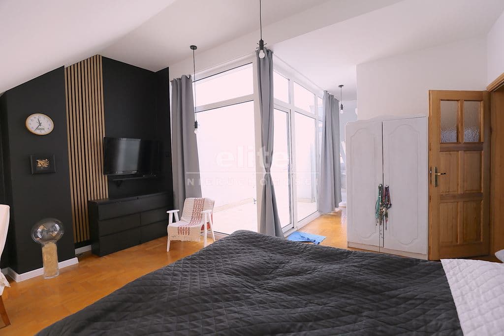 Na poddaszu duża sypialnia własna łazienką oraz wyjściem na zabudowany taras , garderoby oraz następna sypialnia z osobną łazienką .