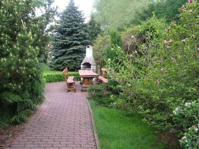 Dom posadowiony na dużej 2800m2 działce obsadzonej 3 tysiącami drzew i krzewów w tym 70 letnie cedry i świerki. Przy domu podgrzewany basen o wymiarach 6x 10 m i 1,5 m głebokości. W dalszej części ogrodu miejsce na grill