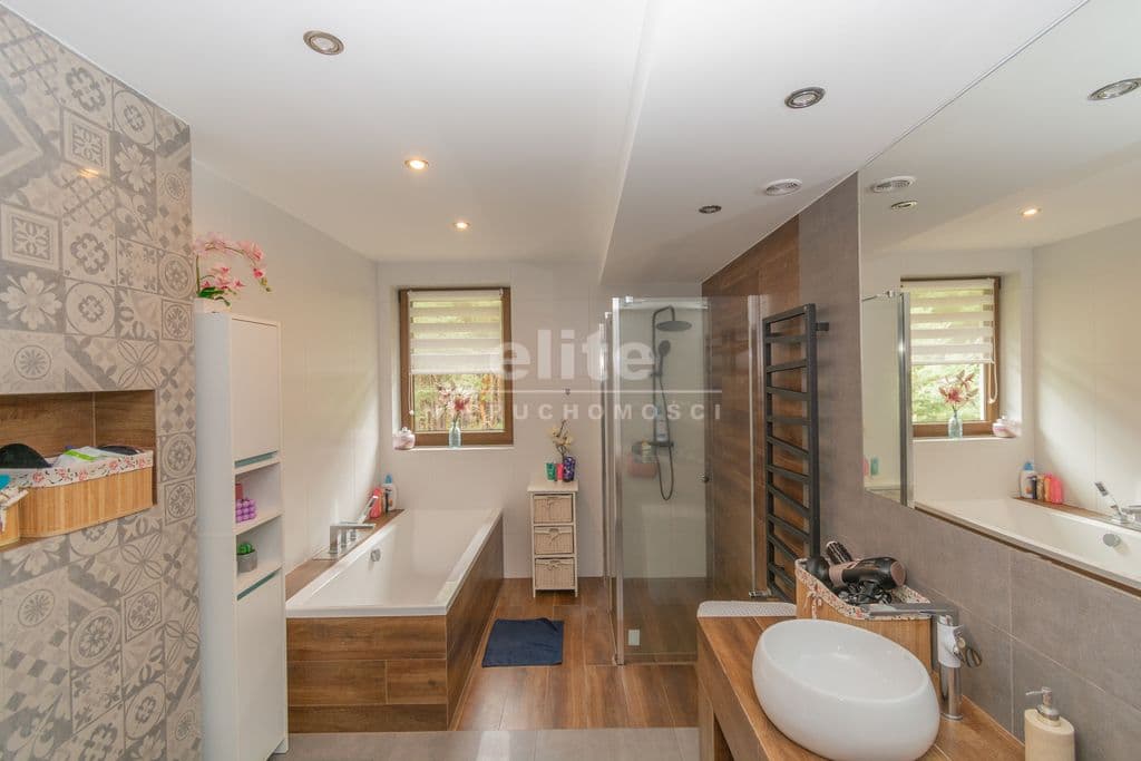 - Duża łazienka z prysznicem, wanną i dwiema umywalkami