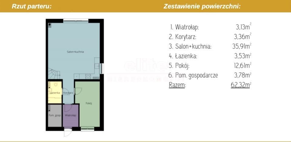 Parter : salon z aneksem kuchennym o pow. 36 m2 z wyjściem na taras i ogród od strony południowej lub zachodniej , pokój z przeznaczeniem na biuro lub pokój gościnny o pow. 13m2 , łazienka o pow. 4 m2 oraz pomieszczenie gospodarcze o pow.4 m2. korytarz o pow. 6,5 m2