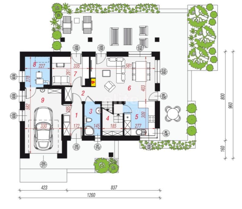 - zabudowana budynkiem mieszkalnym, ozdobiona drzewkami i krzewami, ogrodzona;