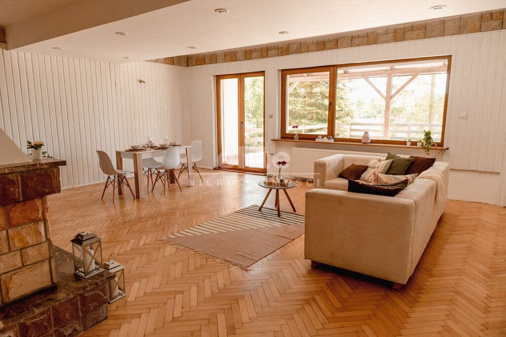 Na powierzchnię 430 m2 składają się:* Parter - salon z kominkiem i wyjściem na taras, trzy sypialnie, kuchnia, jadalnia, spiżarnia, łazienka, toaleta, garderoba, korytarz, przedsionek,