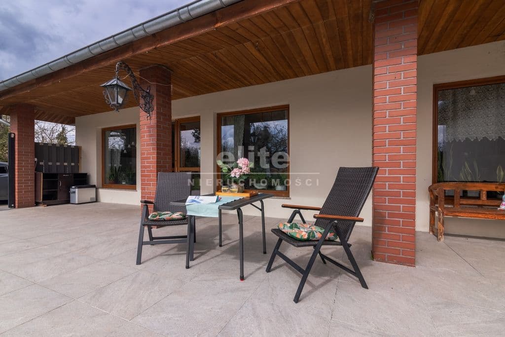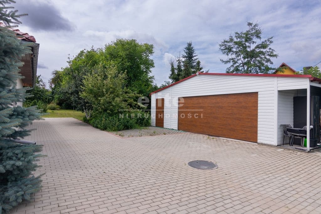Od strony południowej zaprojektowany jest kilkudziesięciometrowy taras, na który wyjdziemy z salonu lub głównej sypialni. Na działce znajduje się wolnostojący garaż o powierzchni ponad 50 m 2 , z szeroką na 5 m bramą na pilota. W części garażu jest wzmocniona posadzka (beton b20).