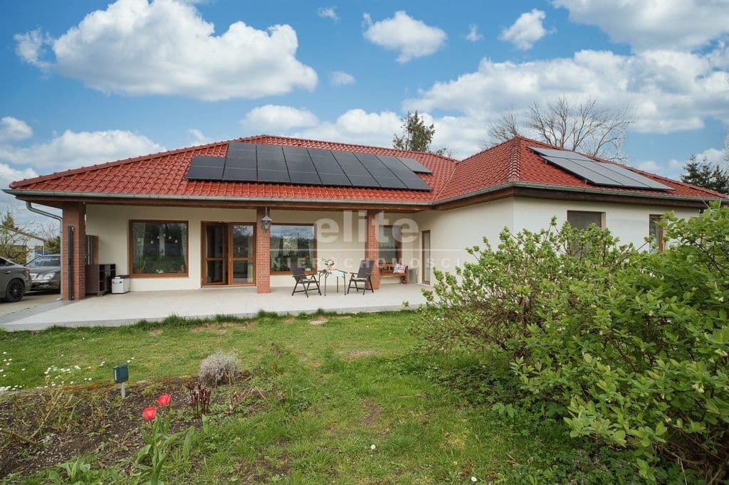 Nasz dom to przestronna parterówka z poddaszem do zaadaptowania usytuowana na zielonej, ładnie zagospodarowanej działce o powierzchni 1864 m 2 zlokalizowanej na skraju wsi. Powierzchnia całkowita budynku to 265 m 2, z czego wykończony jest parter (190 m 2 - salon z jadalnią, kuchnia, trzy sypialnie, gabinet, garderoba, dwie łazienki oraz hol i kilka pomieszczeń gospodarczych). Drugi poziom (75 m 2 ) jest do aranżacji wg. potrzeb nowego właściciela - w projekcie są dwie duże sypialnie, łazienka i garderoba).