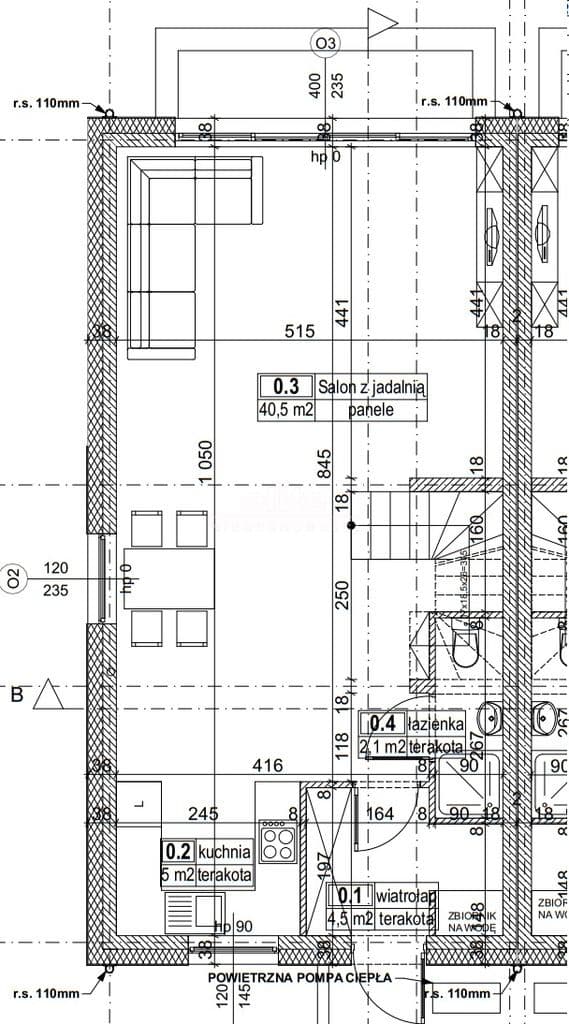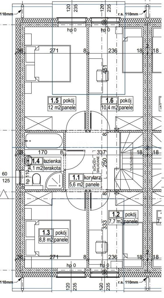 • ściany konstrukcyjne murowane, ocieplone styropianem 20 cm.