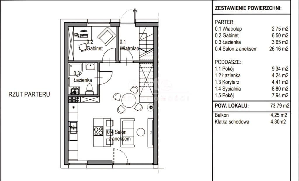 Powierzchnie lokali: 73,79 m kw. (powierzchnia całkowita: 117,25 m kw.)