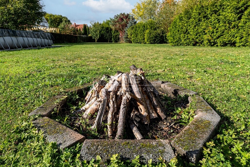 Duża działka o powierzchni 2215 m², pięknie zagospodarowana z dbałością o każdy szczegół. Na działce wygospodarowana przestrzeń na basen, miejsce na grilla z licznymi nasadzeniami , dużą ilością kwiatów, krzewów i roślin ozdobnych. Teren w całości ogrodzony. Na działce znajduje się wiata garażowa na dwa samochody i garaż blaszany, dwie bramy wjazdowe i dwa miejsca postojowe przed domem.