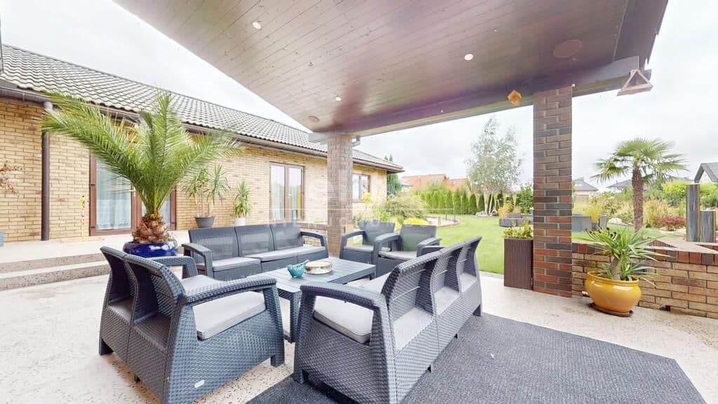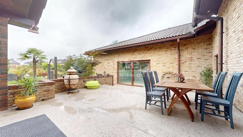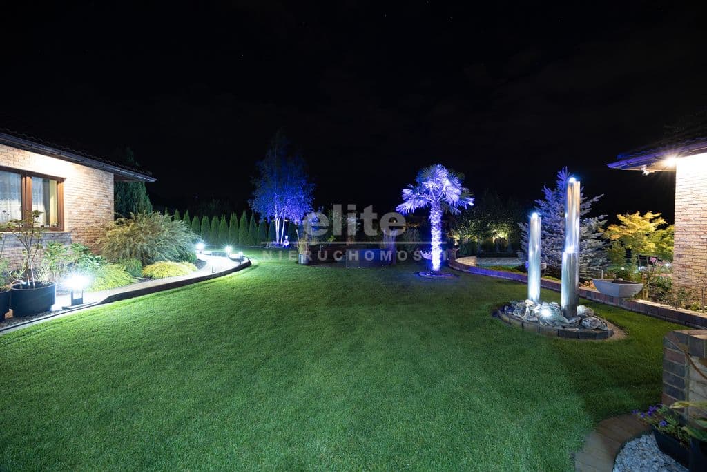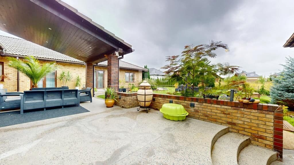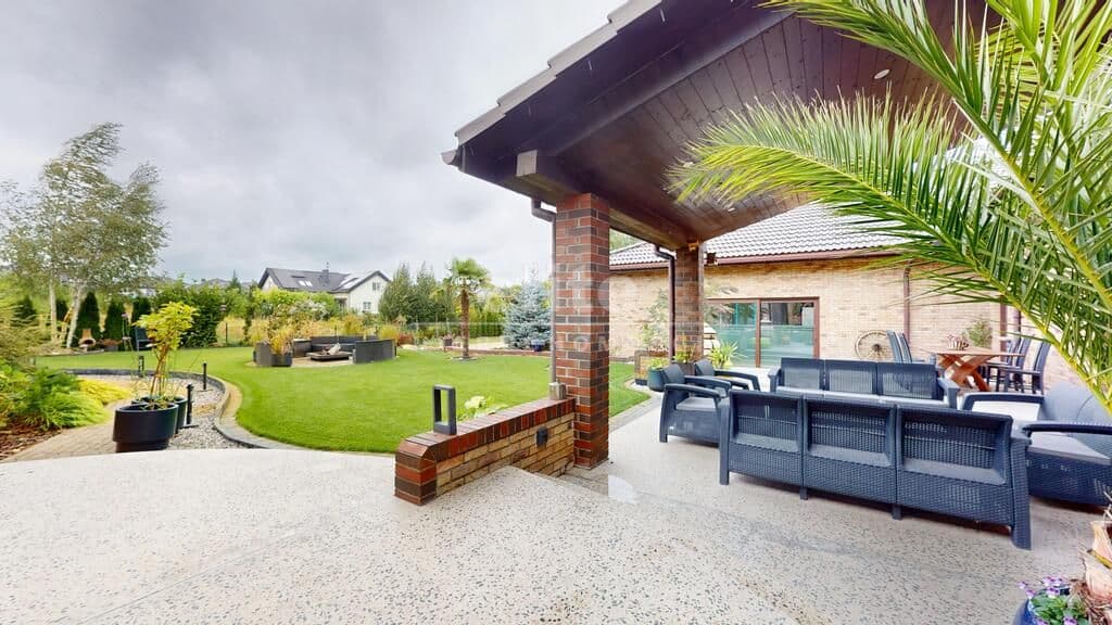 Otoczenie domu stanowi pięknie zagospodarowany ogród z licznymi nasadzeniami, zmodernizowany i na nowo zaaranżowany w 2024 roku. Wyznaczonych zostało kilka stref relaksu-do największych z nich należy zaliczyć duży 80 m2 taras, częściowo zadaszony, wykonany z kamienia naturalnego Lastrico, gdzie nasz czas będzie umilał widok nowoczesnej fontanny, a o klimat zadba kominek oraz własna wędzarnia.
