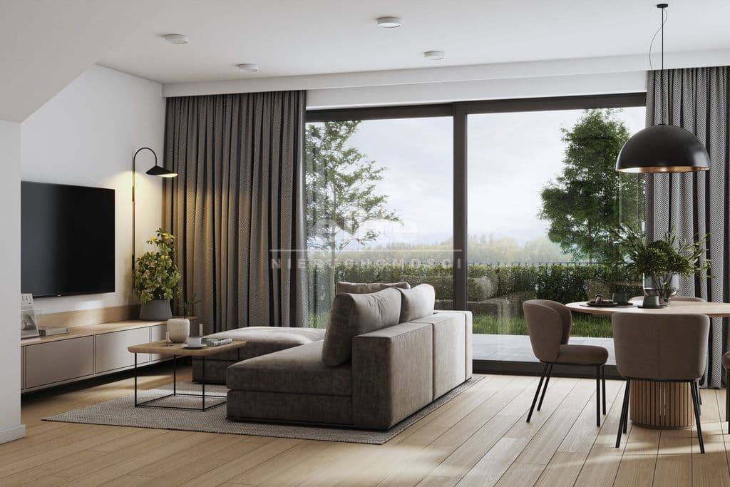 Słoneczny Salon z Aneksem (30 m²): Wielkie okna sprawiają, że wnętrze jest dosłownie zalane naturalnym światłem. Idealne miejsce do życia rodzinnego i przyjmowania gości.