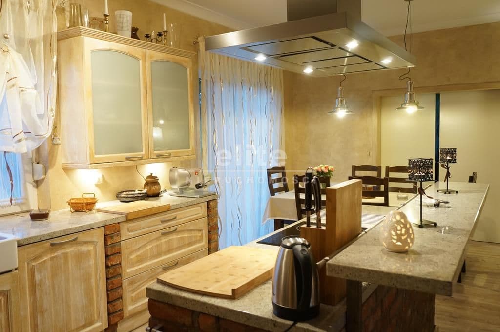 Wykończenie – zabudowa wysokiej klasy meblami z litego drewna oraz granitowymi blatami, na podłodze położona deska bielona oraz kamienna terakota, ściany pokryte tynkiem strukturalnym i malowane.