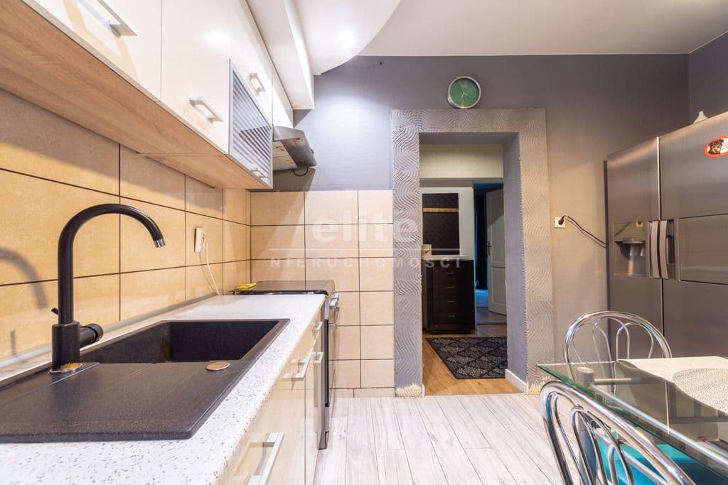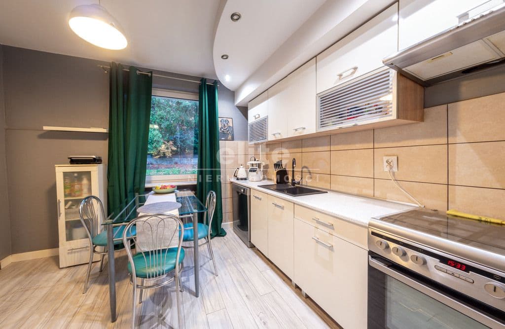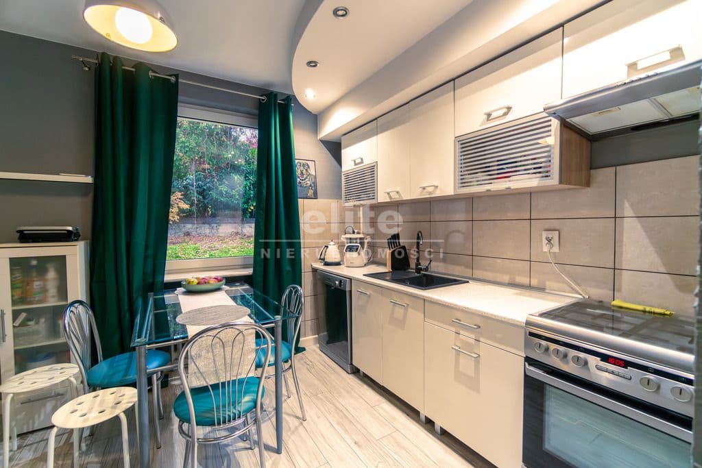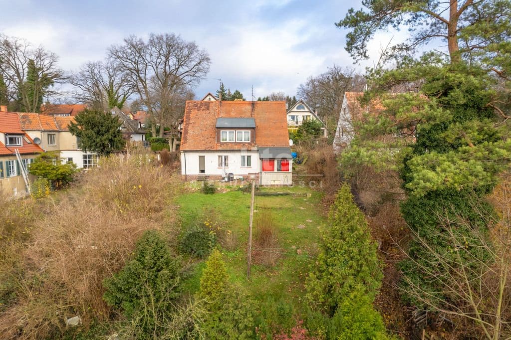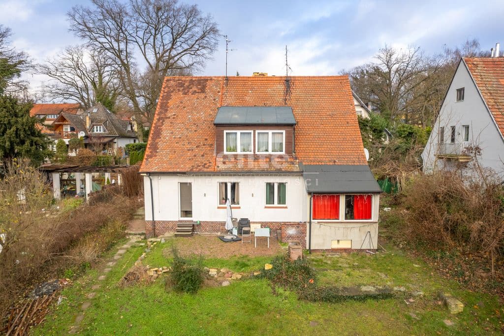 Ogrzewanie : piec na paliwo stałe, tj. węgiel, drewno. Gorąca woda z pieca gazowego jednoobiegowego. Parter ma powierzchnię całkowitą 98,97 m2 i składa się z czterech pokoi, kuchni, przedpokoju i łazienki. Z kuchni jest wejście do piwnicy oraz do ogrodu. Sypialnia ma również wyjście na taras. Nieruchomość ma wyjątkowy klimat. Salon to dwa ogromne pomieszczenia połączone starymi, poniemieckimi, przesuwnymi drzwiami. Nieruchomość posiada garaż wielkości 15m2 oraz piwnice. Atutem nieruchomości jest lokalizacja. W najbliższej okolicy znajduje się park Chopina, las Arkoński w odległości 200 metrów, Syrenie Stawy, kompleks basenowo - rekreacyjny Arkonka. Dookoła jest dużo miejsc spacerowych oraz ścieżek rowerowych. Dojazd do miasta zapewnia tramwaj linii 3 oraz autobus numer 80. Dojazd samochodem do centrum miasta zajmuje około 15 minut. Dom położony jest na wzgórzu z ekspozycją południowozachodnią, z którego roztacza się przepiękny widok. Do nieruchomości są dwa wejścia z dwóch ulic, co jest bardzo wygodne.