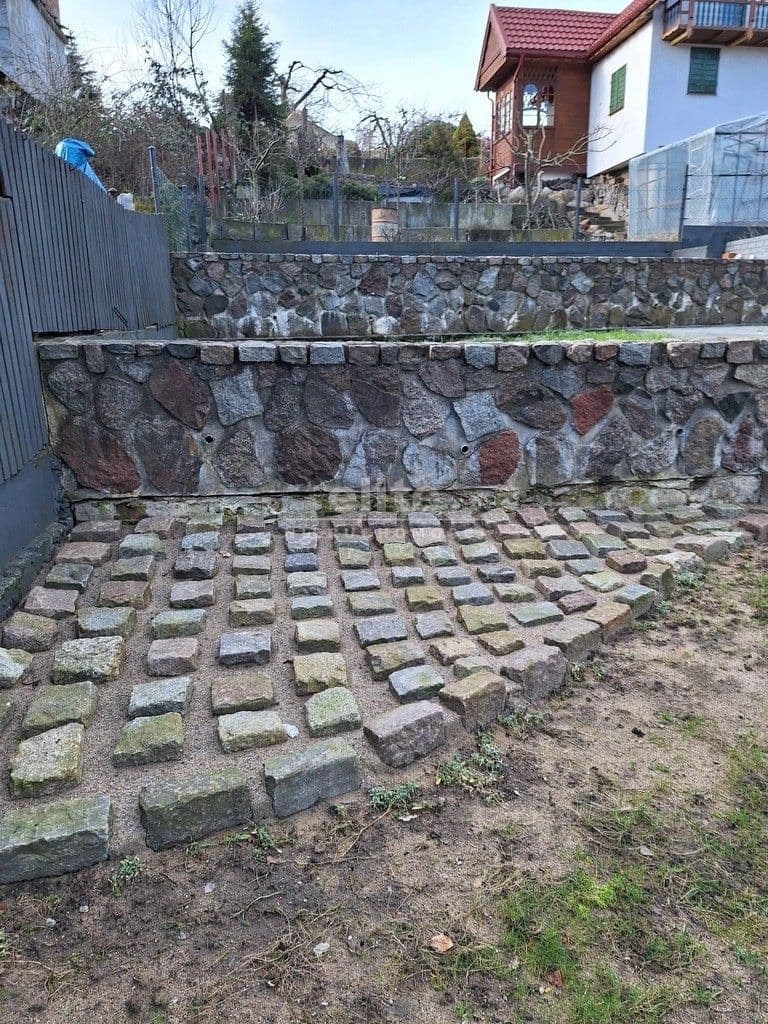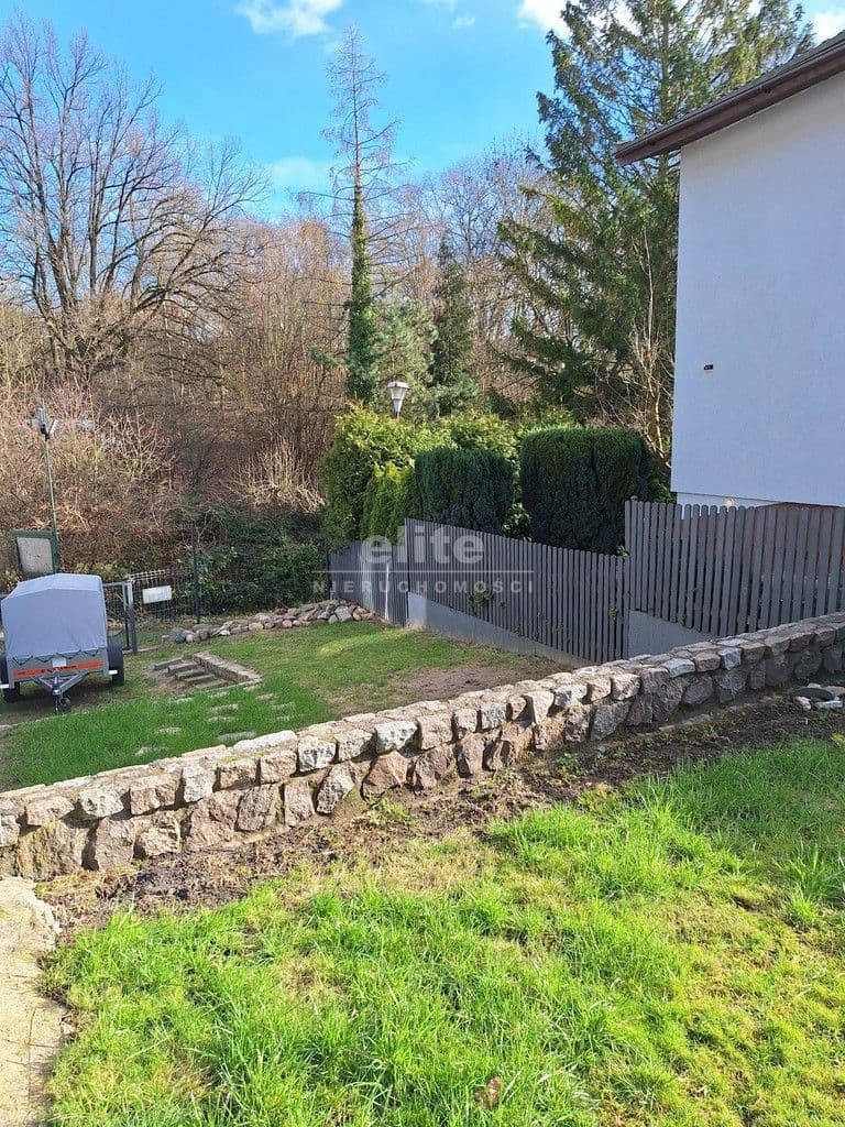 Działka zagospodarowana ozdobnymi murkami z kamienia polnego. Z wyznaczonymi miejscami do odpoczynku i rekreacji, także miejsca na nasadzenia różnego rodzaju roślinami.