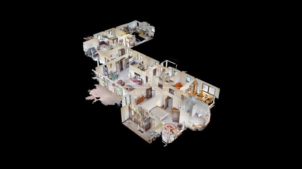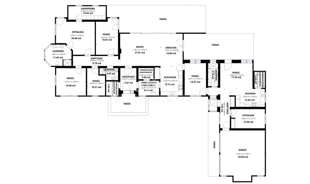 Budynek posiada wydzieloną strefę gościnną i prywatną, wewnętrzne przejście do drugiej części domu, wyjście na taras z czterech pokoi. Nieruchomość składa się z 8 pokoi, 2 kuchni, 3 łazienek, 2 garderób, pomieszczeń gospodarczych.