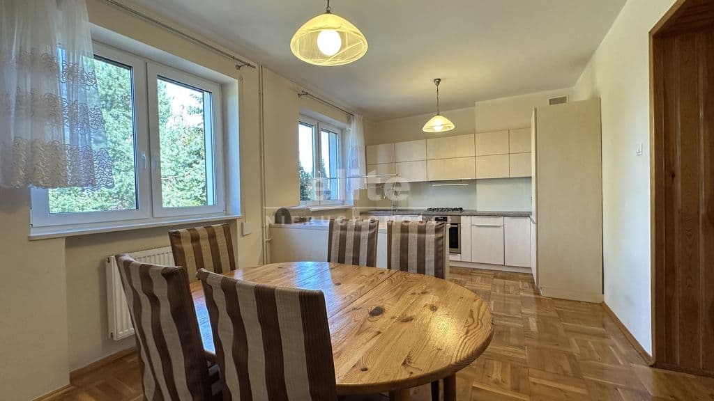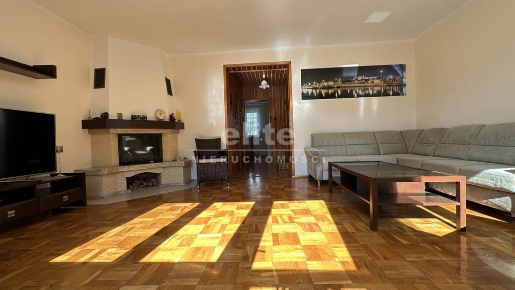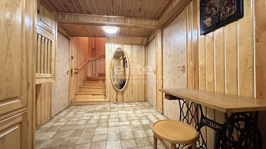 Parter: ze słonecznego salonu (27 m kw.) z kominkiem, z dużymi oknami można wyjść na przestronny taras (22 m kw.) a z niego na śliczny, pięknie utrzymany ogród. Duża jasna, oddzielna kuchnia z jadalnią (20 m kw.) wyposażona jest w duży, wygodny stół z krzesłami. Znajduje się tutaj również łazienka z prysznicem.