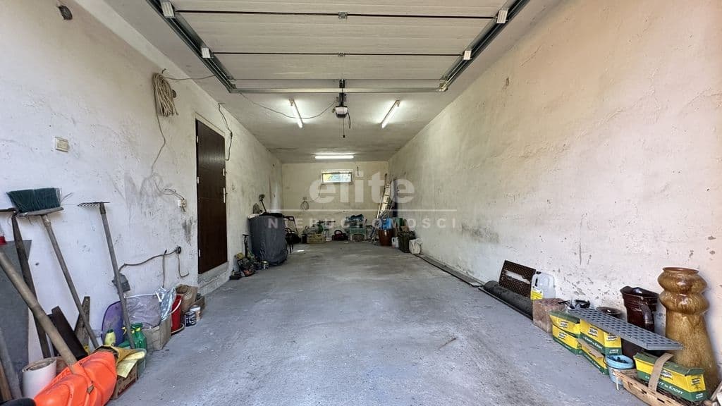 Hala garażowa: Na wprost bramy wjazdowy usytuowany jest bardzo duży (około 40 m kw.), dwustanowiskowy, wysoki, murowany, wyposażony w "siłę" garaż.