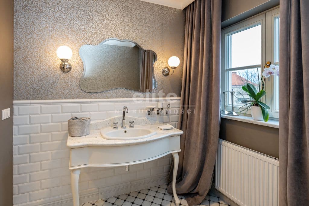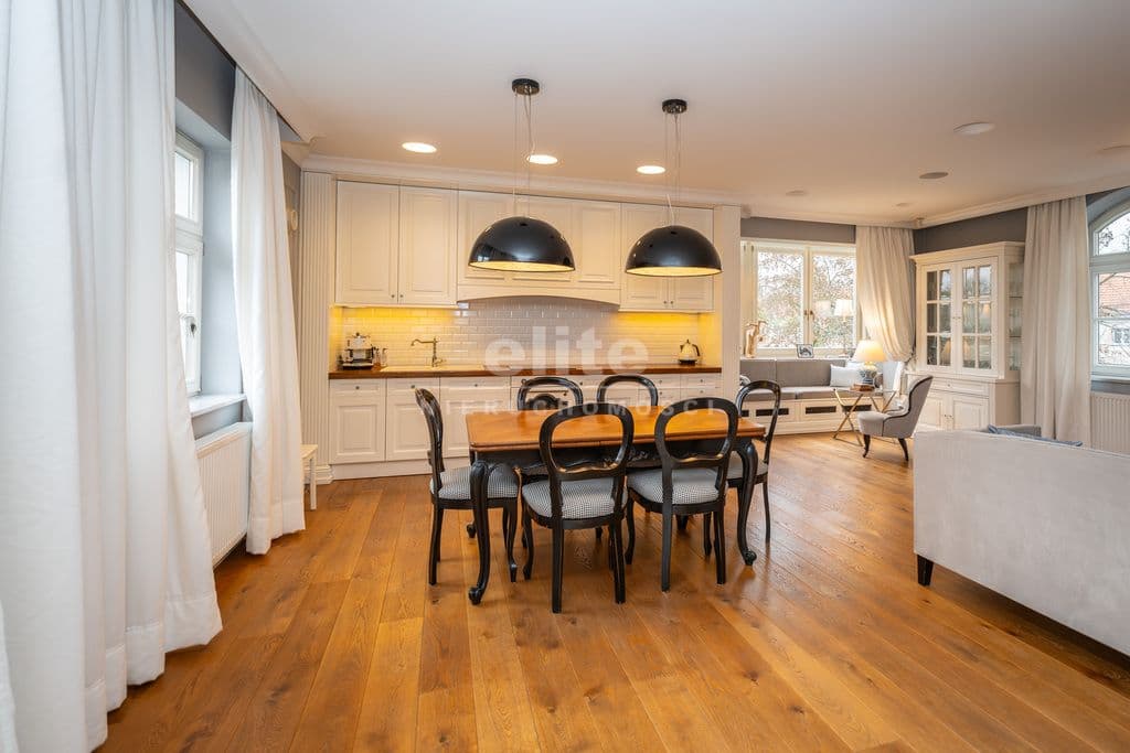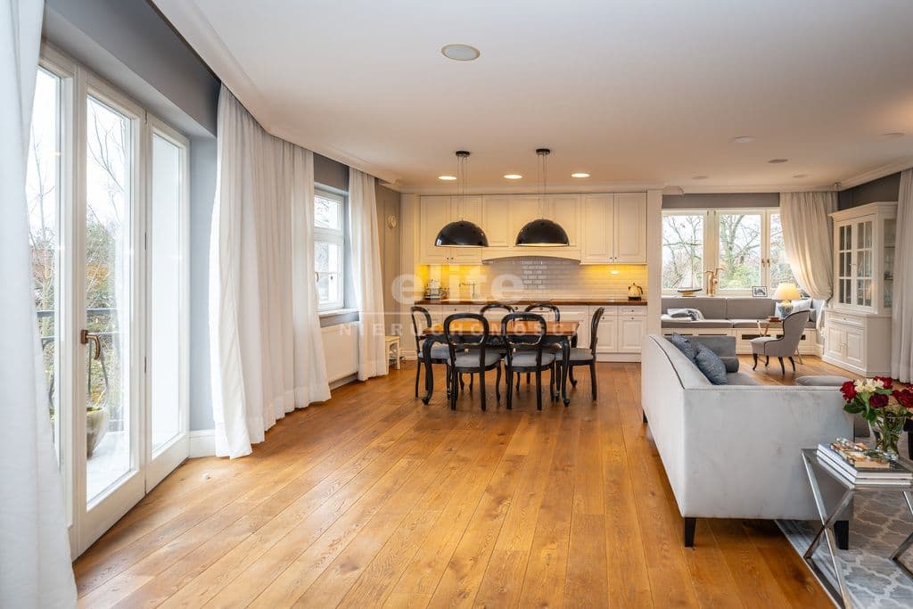 To wnętrze, które zachwyca dbałością o detal i ponadczasową klasą. Dominuje piękna, olejowana deska dębowa na podłogach, wysokie listwy przypodłogowe, sztukaterie ścienne i sufitowe, klasyczne proporcje pomieszczeń. Szaro-beżowa paleta barw przełamana głęboką zielenią i czernią, welurowe sofy, żyrandole w stylu glamour, kominek wolnostojący w salonie. Kuchnia otwarta na jadalnię w bieli i drewnie,. Łazienki wykończone marmurem i mozaiką w stylu retro (wanna wolnostojąca na lwich łapach, baterie w chromie).