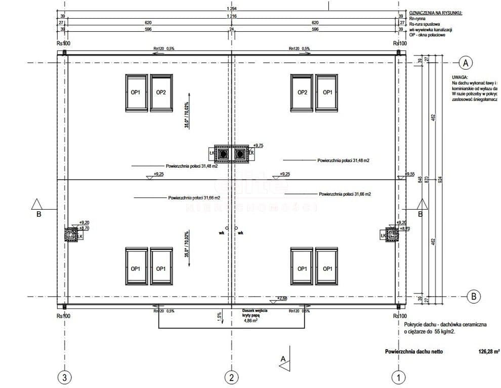 Dach: więźba dachowa drewniana, dachówka ceramiczna, rynny PCV, obróbki blacharskie z blachy stalowej ocynkowanej lub cynkowej