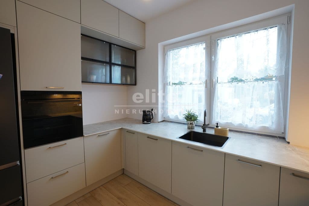 Kuchnia wykonana w nowoczesnej zabudowie, w pełni wyposażona w sprzęt AGD, gotowa do użytkowania bez dodatkowych nakładów finansowych.