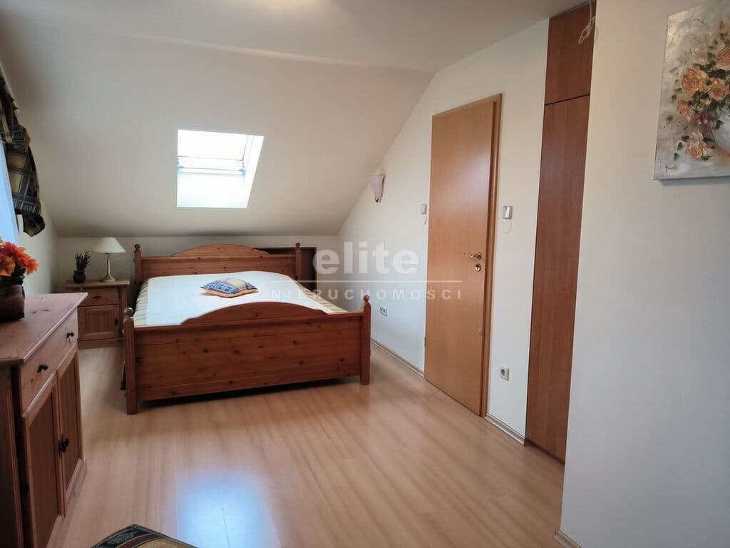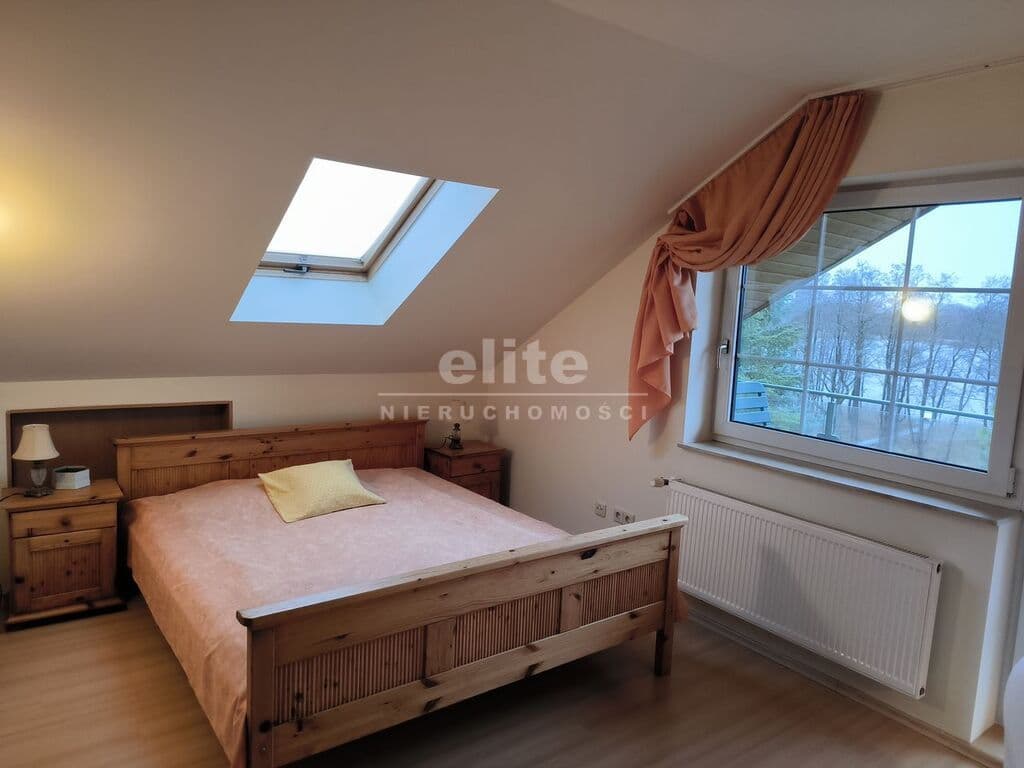Na piętro prowadzą drewniane schody. Znajdują się tu dwie sypialnie z zabudowanymi skosami i wnękowymi szafami. Podłogi wyłożone panelami. Loggia oraz przeszklony balkon oferują widok na jezioro. Na środku piętra znajduje się duża łazienka z oknem i roletą, wyposażona w prysznic oraz wannę z hydromasażem.