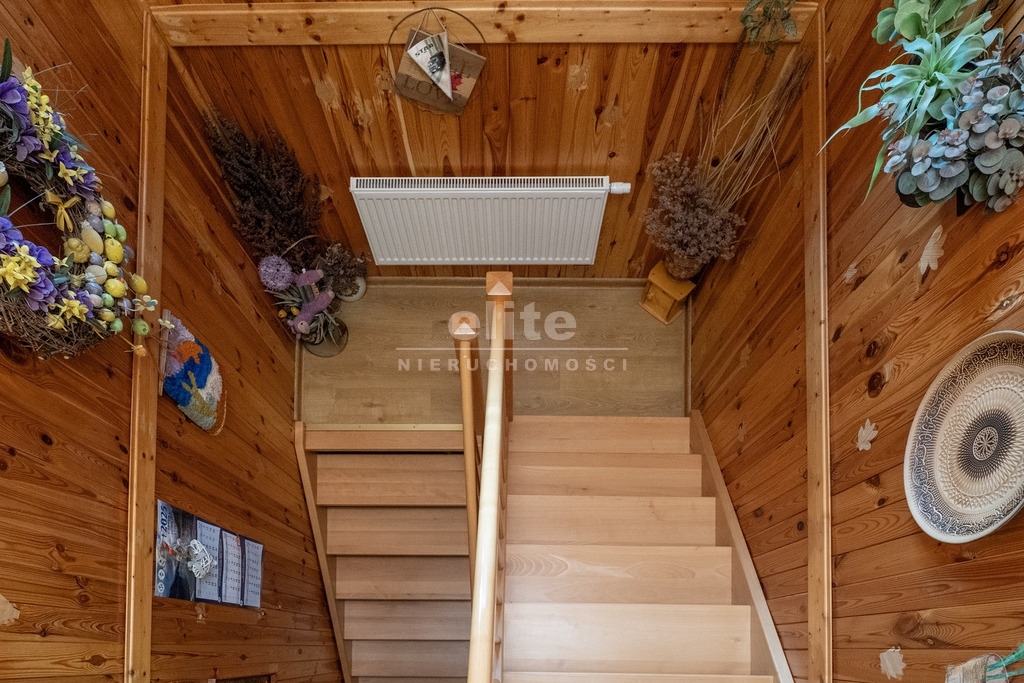 Na piętrze (poddaszu użytkowym) zlokalizowano trzy pokoje, łazienkę oraz korytarz o łącznej powierzchni około 44 m².