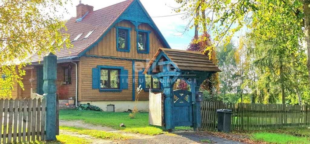 Dom wyróżnia się przepiękną, drewnianą elewacją z niebieskimi okiennicami i detalami, które nadają mu niepowtarzalnego, bajkowego uroku.