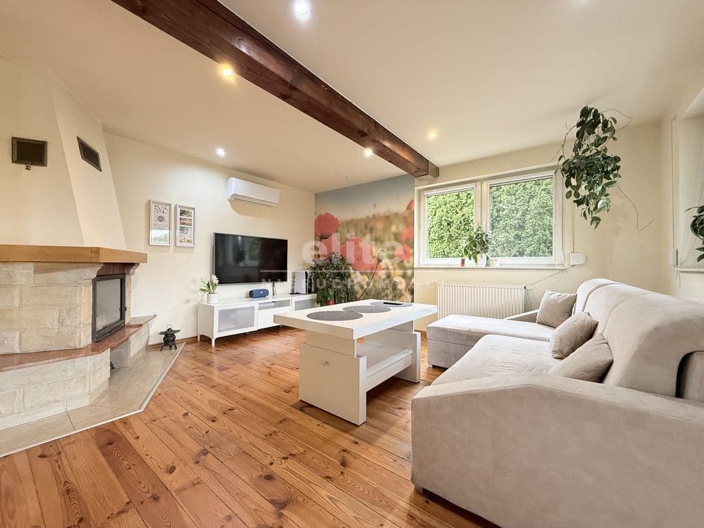 - jasny salon z kominkiem i wyjściem na taras