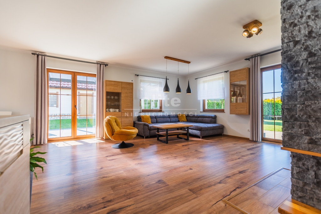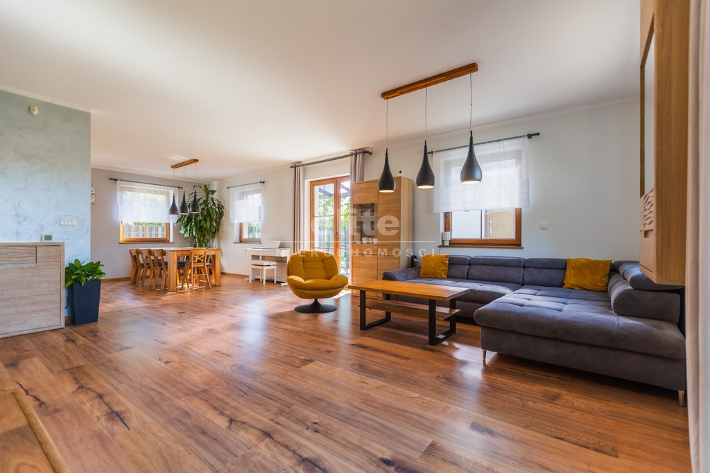 Przestronny salon z kominkiem z , kuchnią i jadalnią tworząc otwartą przestrzeń, toaleta, holl i pomieszczenie techniczne (kotłownia z piecem gazowym dwuobiegowym i zasobnikiem na ciepłą wodę).
