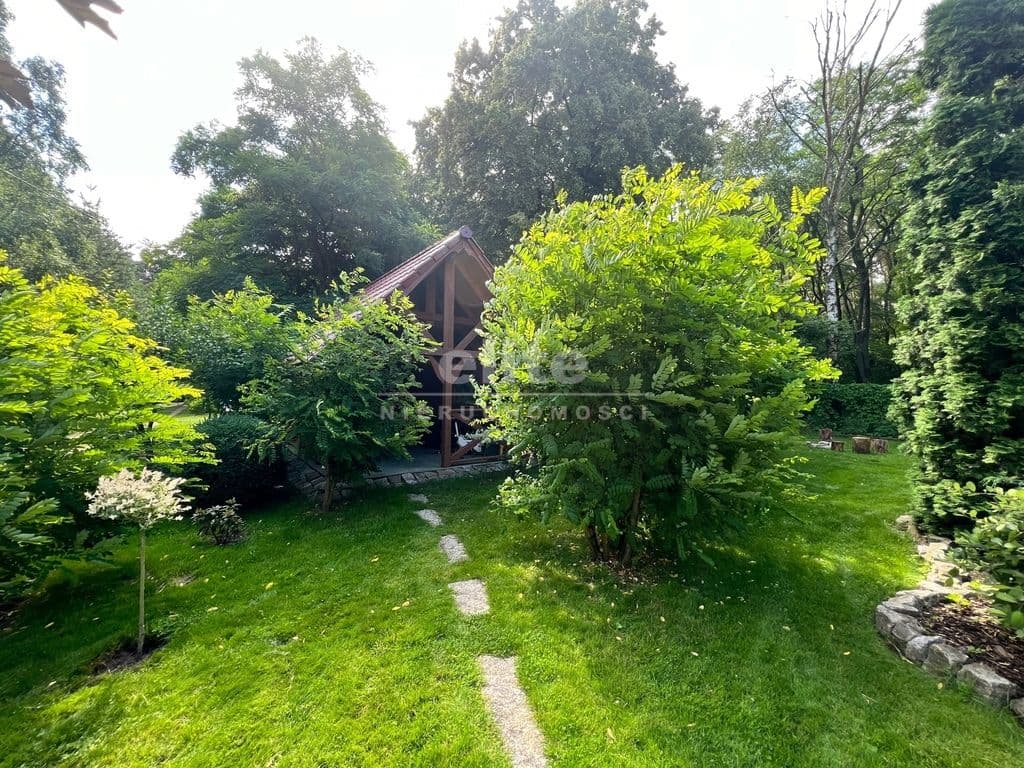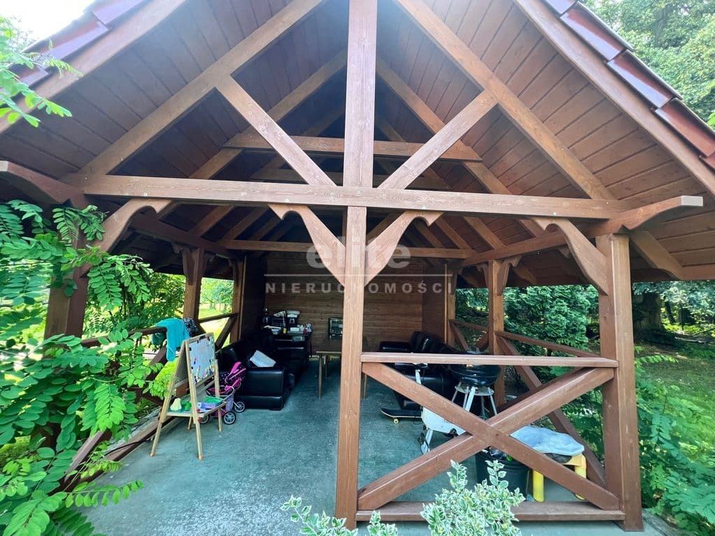 Teren w pełni zagospodarowany, z licznymi nasadzeniami i wybudowaną z drewna wiatą ogrodową idealnie nadającą się na rekreację.